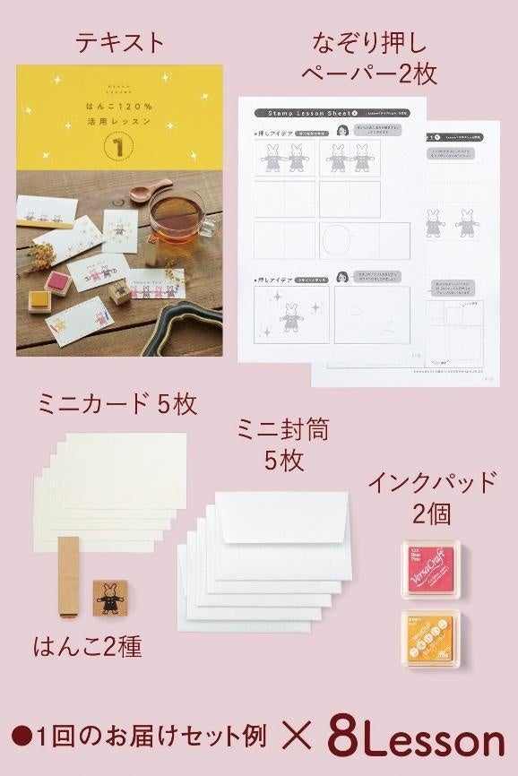 テキスト、なぞり押しペーパー2枚、はんこ1~2種、インクパッド、お楽しみペーパーアイテムなどが届きます。お届けの内容はレッスンごとに異なります。