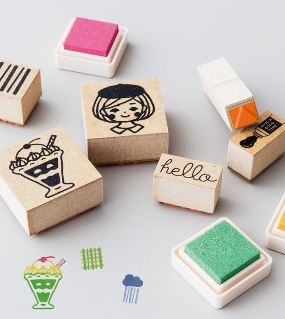 さまざまなモチーフのかわいいはんこや、カラフルなインクパッドが毎月届きます。はんこのデザインは、イラストレーター・消しゴムはんこ作家の「とみこはん」さんと「eric」さんが担当。たくさんのはんこ&インクパッドが集まると、表現の幅も広がります。