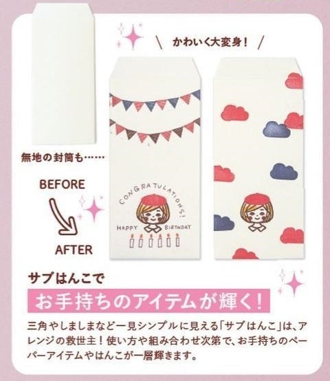 三角や雲、しましまなど一見シンプルに見える「サブはんこ」は、アレンジの救世主です。メインの柄の周りに押して華やかさをプラスしたり、サブはんこの柄を組み合わせて新しくモチーフを作ったりすることで、デコレーションの幅が広がります。使い方や組み合わせ次第で、ペーパーアイテムやはんこが一層輝きます。