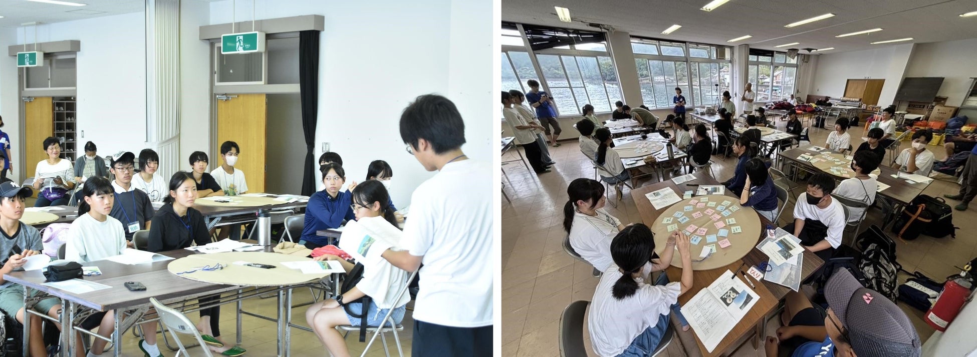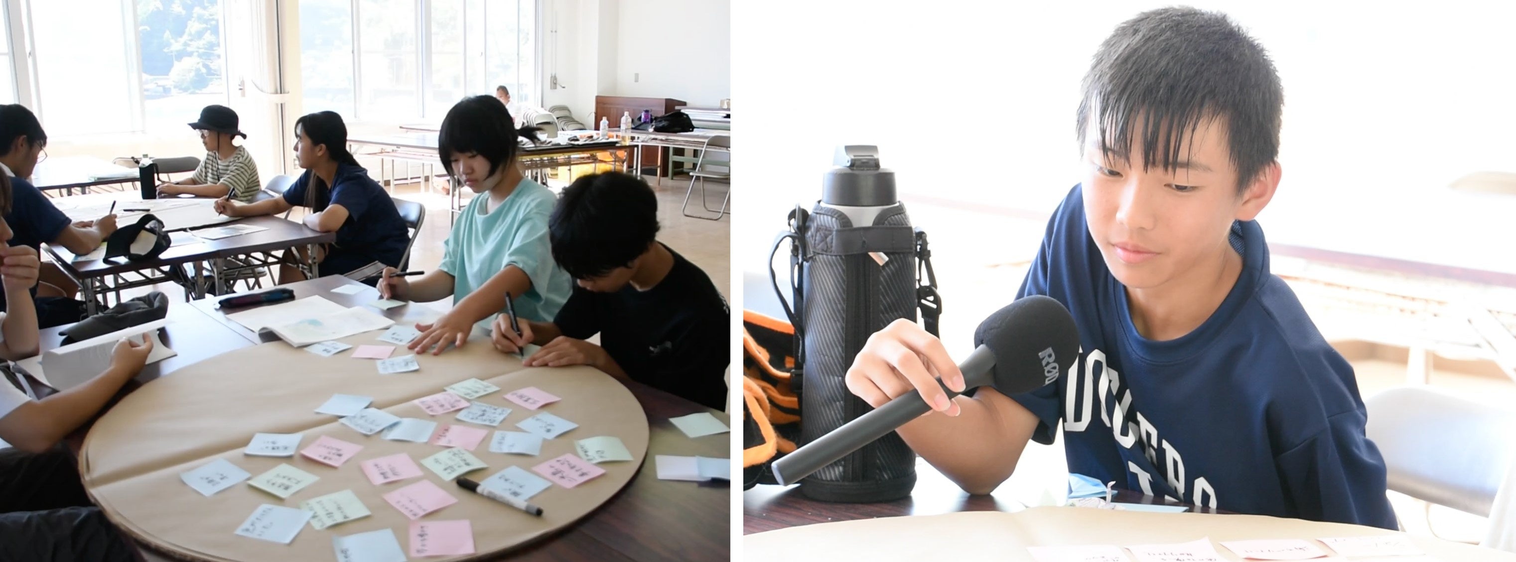 高校生たちの司会によって、2日間の振り返り会を実施しました。初日と同じ5グループに分かれて、以下の質問に、付箋を書きながら2日間の気づきを共有しました。