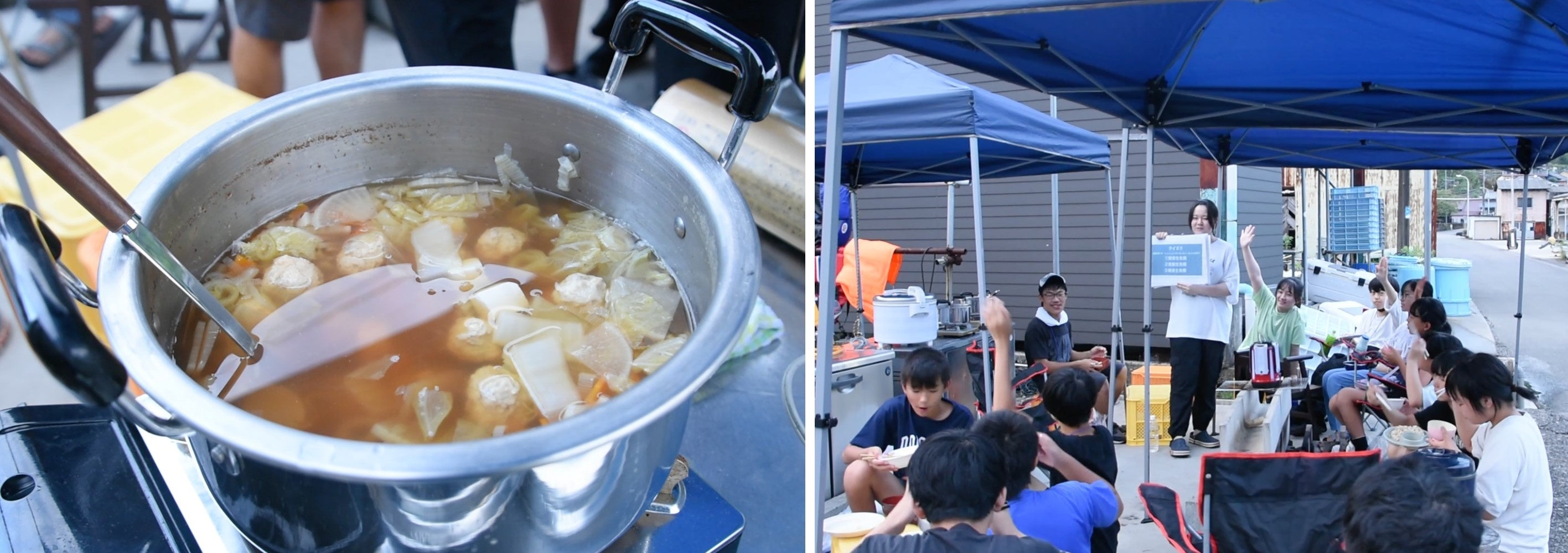 今回参加する高校生は、夏休みに三重県沿岸で海の森(藻場)の減少が急速に進んでいる現状を学び、その解決策として藻場の減少(磯焼け)の原因の一つであるシーベジたべるフィッシュを美味しく食べるために、事前に学校で商品レシピの試作を重ねてきました。高校生たちは、食の専門家にもアドバイスをもらいながら商品開発中のアイゴのつみれ汁と炊き込みご飯を、小中学生に振る舞いました。アイゴ料理を食べてもらいながら、クイズ形式でアイゴのことやアイゴの魅力について高校生たちは力説していました。小中学生は、おかわりをしてアイゴ料理を味わっていました。