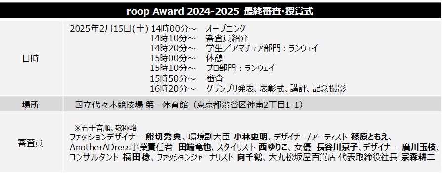 大丸松坂屋百貨店が運営するファッションサブスクリプションサービス “AnotherADdress(アナザーアドレス)” が主催する、ファッションデザインコンテスト『roop Award 2024-2025』の一次審査会を実施し、最終審査にお進みいただく20名(プロ部門、学生/アマチュア部門 各10名)のファイナリストが決定いたしました。最終審査・授賞式は、クリエイションの祭典 「NEW ENERGY TOKYO」とタッグを組み、国立代々木 第一体育館にて2025年2月15日(土) に開催します。当日は、審査員による審査を経て、グランプリほか各賞を決定・発表する予定です。一般のお客様のご観覧は、100名様限定で事前登録いただくとステージ前方優先ゾーンにてご観覧いただけます。なお、事前登録されていない方でも座席数に余裕がある際は、当日ご観覧いただけます。(観覧料は無料)