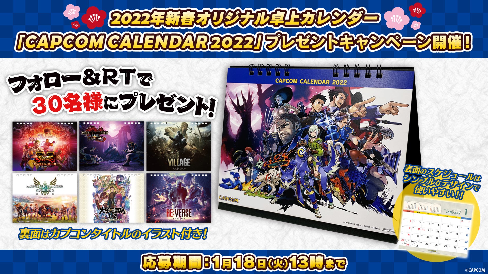 「CAPCOM公式」Twitter(@capom_official)フォロー&対象ツイートをRTした方を対象に、オリジナル卓上カレンダー「CAPCOM CALENDAR 2022」を抽選で30名様にプレゼント。