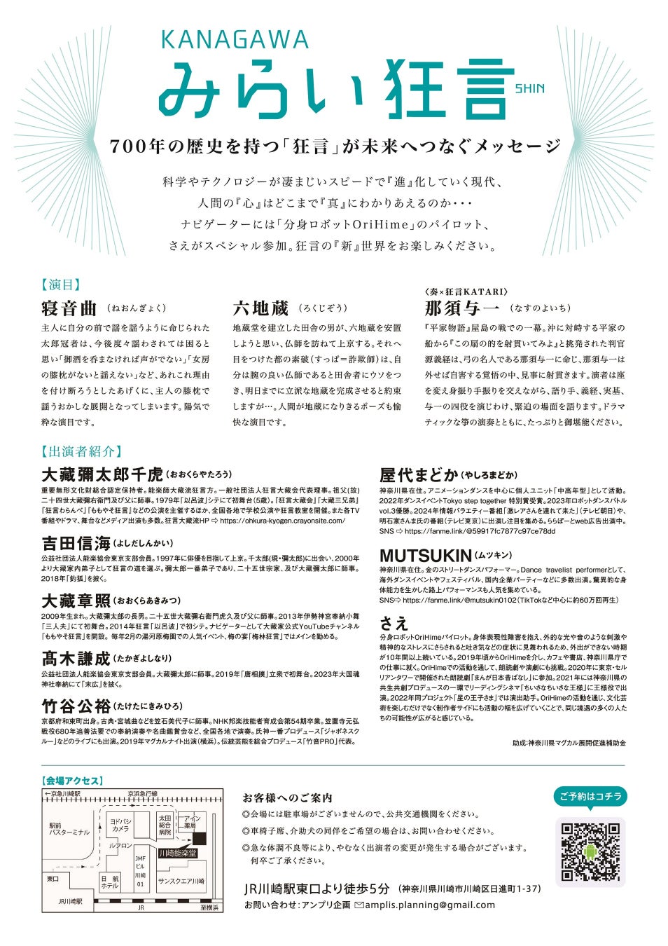 『KANAGAWAみらい狂言』が2025年2月8日 (土)に川崎能楽堂(神奈川県川崎市川崎区日進町1-37)にて開催されます(主催:アンプリ企画)。