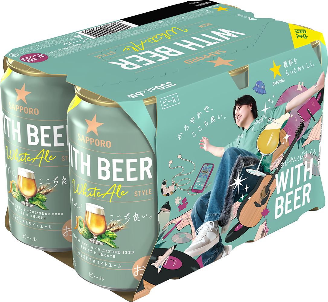広告では、Novelbrightボーカルの竹中雄大さんが「サッポロ WITH BEER ホワイトエール」とじぶん時間を軽やかに楽しむ様子を表現しました。店頭では、このキービジュアルがデザインされた6缶パックやPOPを展開予定です。