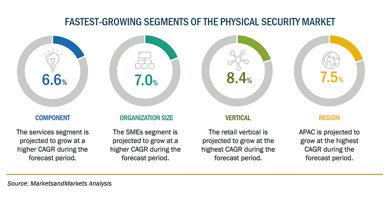 COVID-19の状況下において、窃盗や強盗の被害が増加したことで、ビデオ分析などの利点により、監視ベースの物理的セキュリティシステムおよびサービスの需要が増加しました。現在、多くの企業がWHOやハイブリッドワークモデルを採用しているため、効果的なセキュリティを実現するために、セキュリティ評価に向けた物理的セキュリティの需要がさらに増加すると思われます。