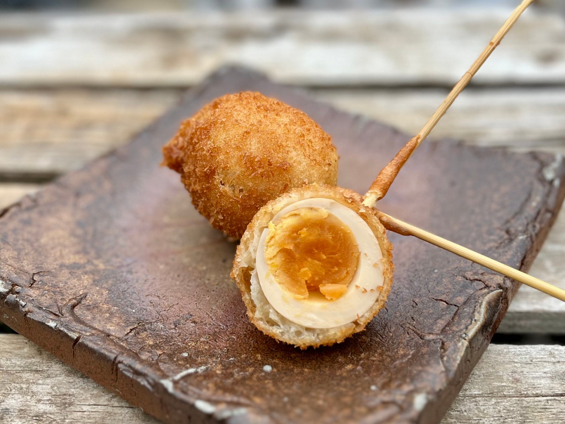 食い倒れの街大阪で1997年に創業した串カツ専門店。半熟煮付け玉子をオリジナルのクロワッサン生地で巻いた冷めてもおいしい串カツです。