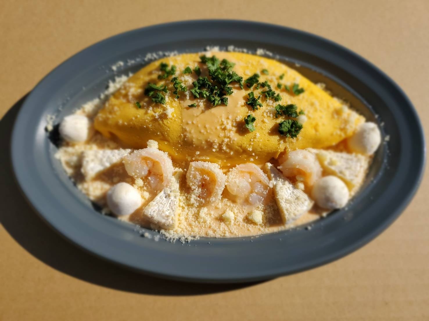 濃厚なクリームと発酵食材を組み合わせてできるオリジナルコロッケを展開するクリームコロッケ専門店からご紹介する商品は、チキンのケチャップライスを、ふっくら仕上げた卵で包み込み、たっぷりの海老のビスククリームソースと、4種のチーズで仕上げたたっぷりソースの特製オムライスです。