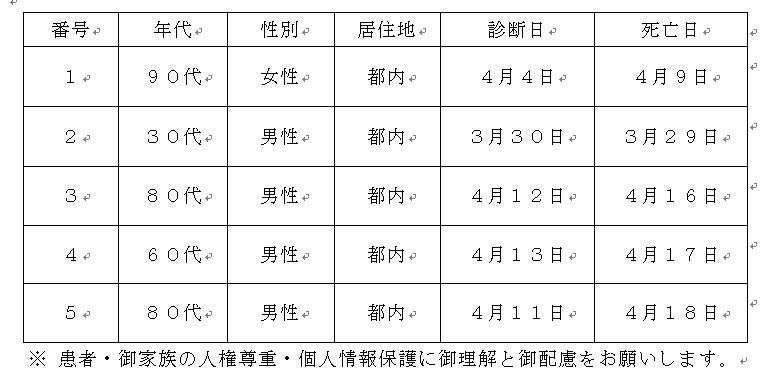 都内で新型コロナウイルスに感染した方が死亡されましたのでお知らせします。