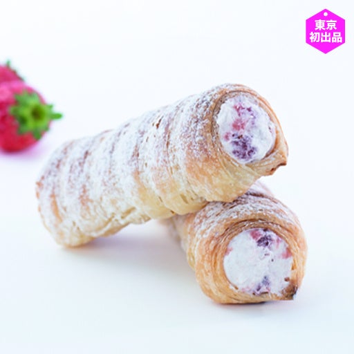 会場内で焼き上げたサクサク生地に、いちごピューレ入りの白あんクリームをたっぷり詰めた春コルネ。
