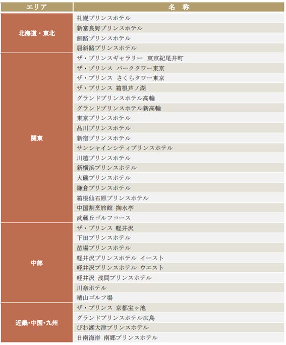 ザ・プリンス パークタワー東京、ザ・プリンス 箱根芦ノ湖、グランドプリンスホテル高輪、川越プリンスホテル、新横浜プリンスホテル、大磯プリンスホテル、鎌倉プリンスホテル、札幌プリンスホテル、新富良野プリンスホテル、軽井沢プリンスホテル
