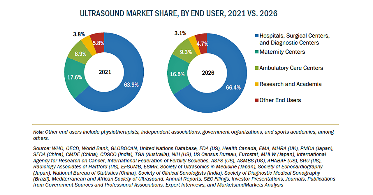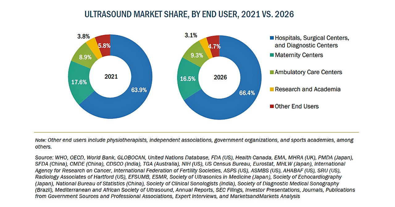 超音波の市場規模は、2021年の67億米ドルからCAGR6.3%で成長し、2026年には90億米ドルに達すると予測されています。診断・治療用超音波画像診断の分野における継続的な技術の進歩、成熟市場における診断用超音波検査の医療費償還の可能性、血管画像診断におけるドップラー超音波や腫瘍学における3D/4D超音波など、新興超音波技術の応用の拡大が超音波市場の成長を促進しています。