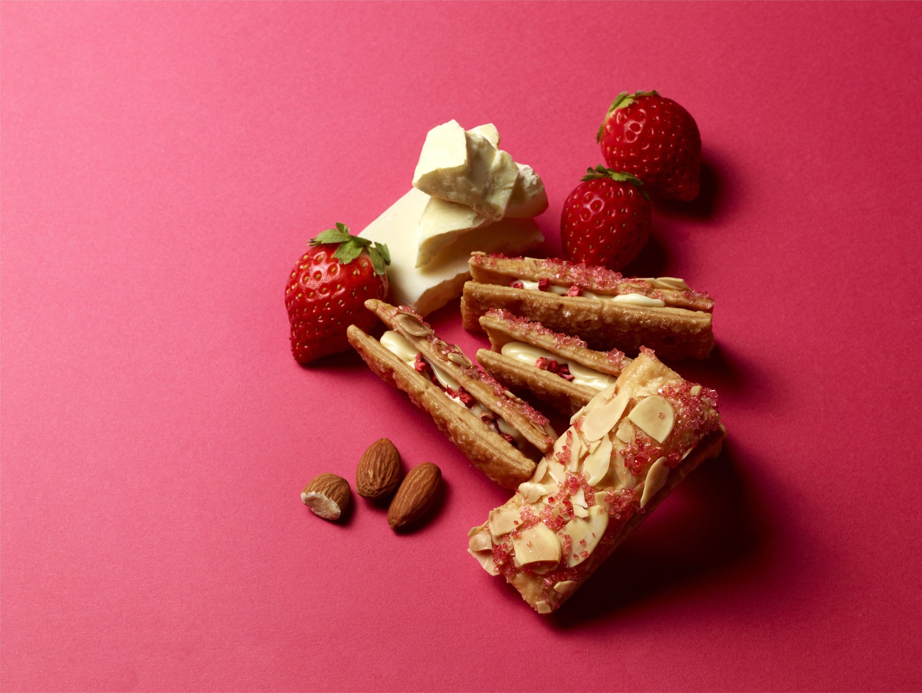 お菓子の王様「ナポレオンパイ」の愛称で呼ばれるいちごのミルフィーユをイメージした焼菓子です。さわやかな酸味が特徴のホワイトチョコクリームとフリーズドライの苺を、バターが香るサクサクのパイ生地でサンドしました。上品な甘さのざらめ糖とアーモンドで着飾った「かわいらしい皇帝(ボン・ナポレオン)」をぜひお召しあがりください。