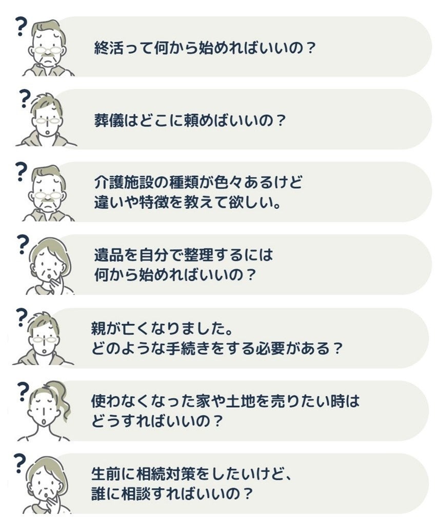 ご自身の身じまいの仕方、次の世代への遺し方(相続対策)から、受け継ぎ方としての相続まで、事業者、士業などの専門家のご紹介窓口として、お気軽に相談いただけます。