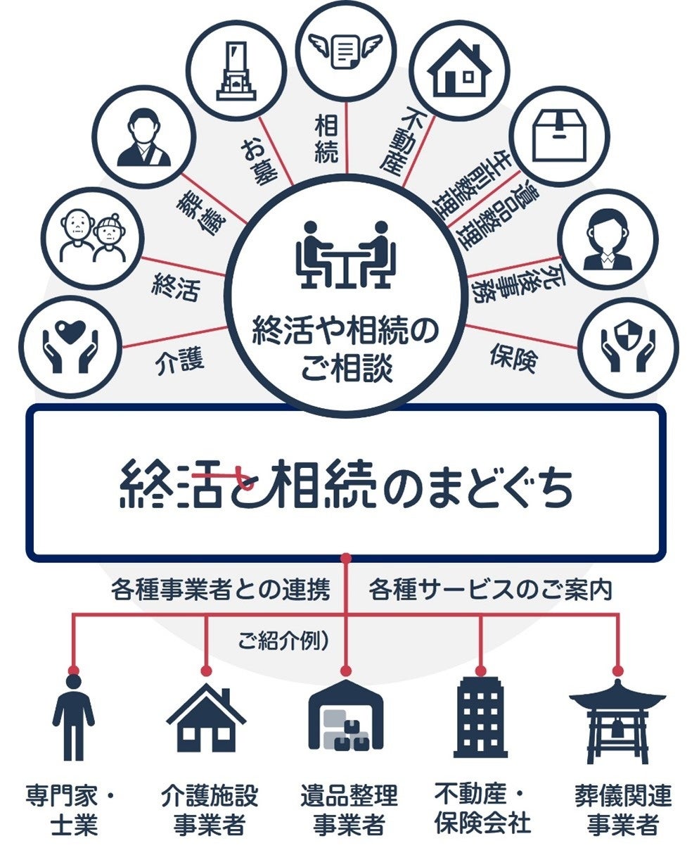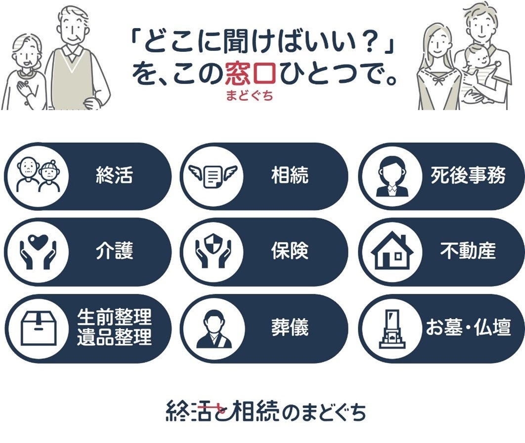 そこで、「株式会社終活のまどぐち」は、終活やご葬儀、相続に関するご相談をワンストップで承る窓口サービス『終活と相続のまどぐち』を創設いたしました。