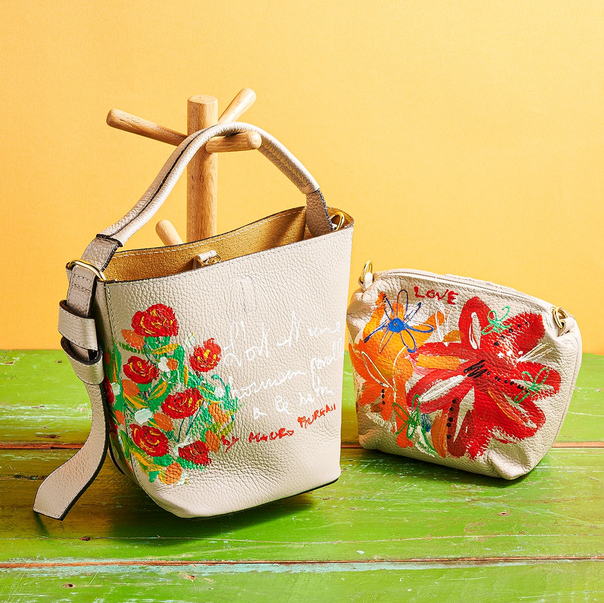 フィレンツェの職人が作る牛革バッグに、アーティストのマウロ・ブラーニ氏が1点1点手描きのアートを描いたバッグ。お出かけが楽しくなりそうなカラフルな色合いが魅力。