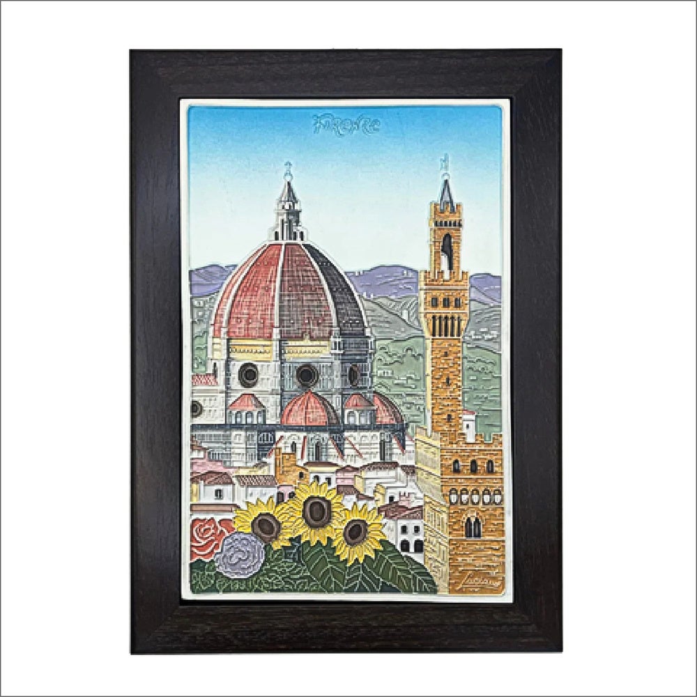 フィレンツェのサンタ マリア デル フィオーレ大聖堂とヴェッキオ宮殿が装飾された陶板画。スプレーと筆を使用したマットな装飾が独特な雰囲気を醸し出します。