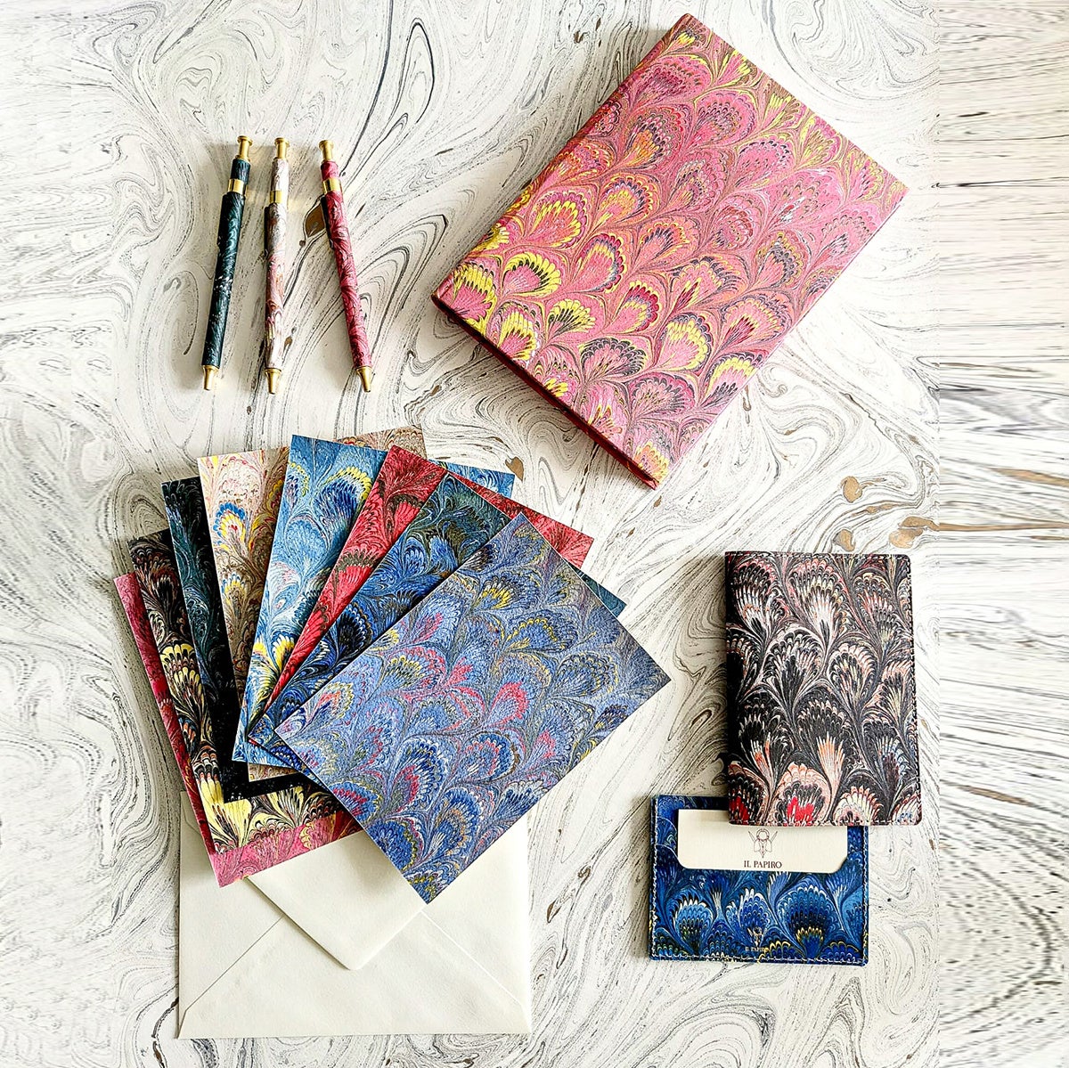 17世紀から受け継がれるイタリアのマーブル染の紙で作る、色とりどりのステーショナリー。植物由来の染料を使用し、職人が丁寧に一枚ずつ染色しています。