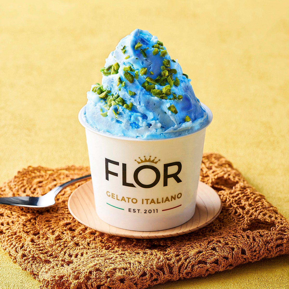 スピルリナで青く色付けした2色のジェラートにシチリアのレモンソルベを加え、クラッシュしたピスタチオをオン。
