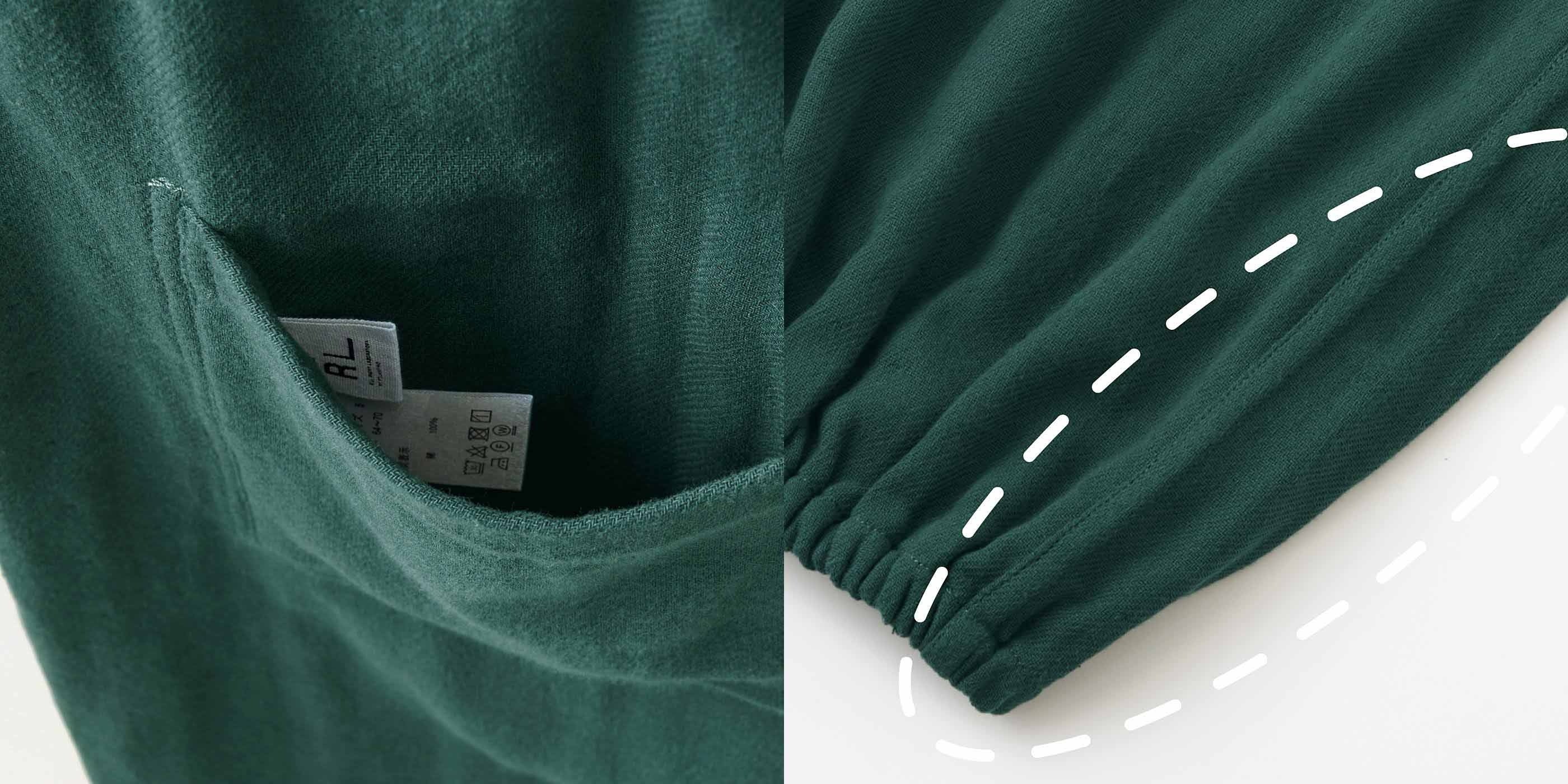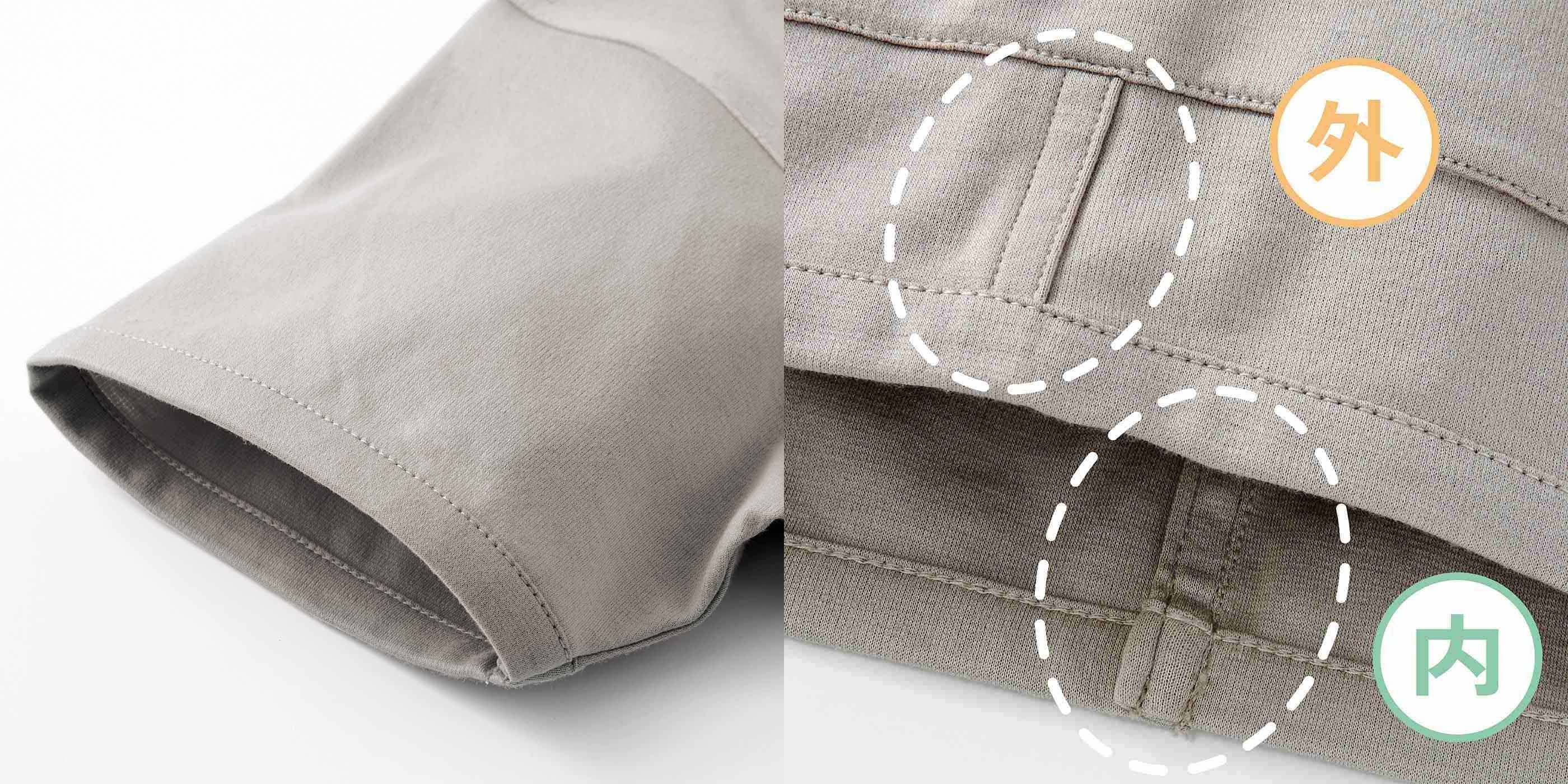 (左)袖口・衿ぐり・すそは、裏と表が気にならないバインダー仕様です。