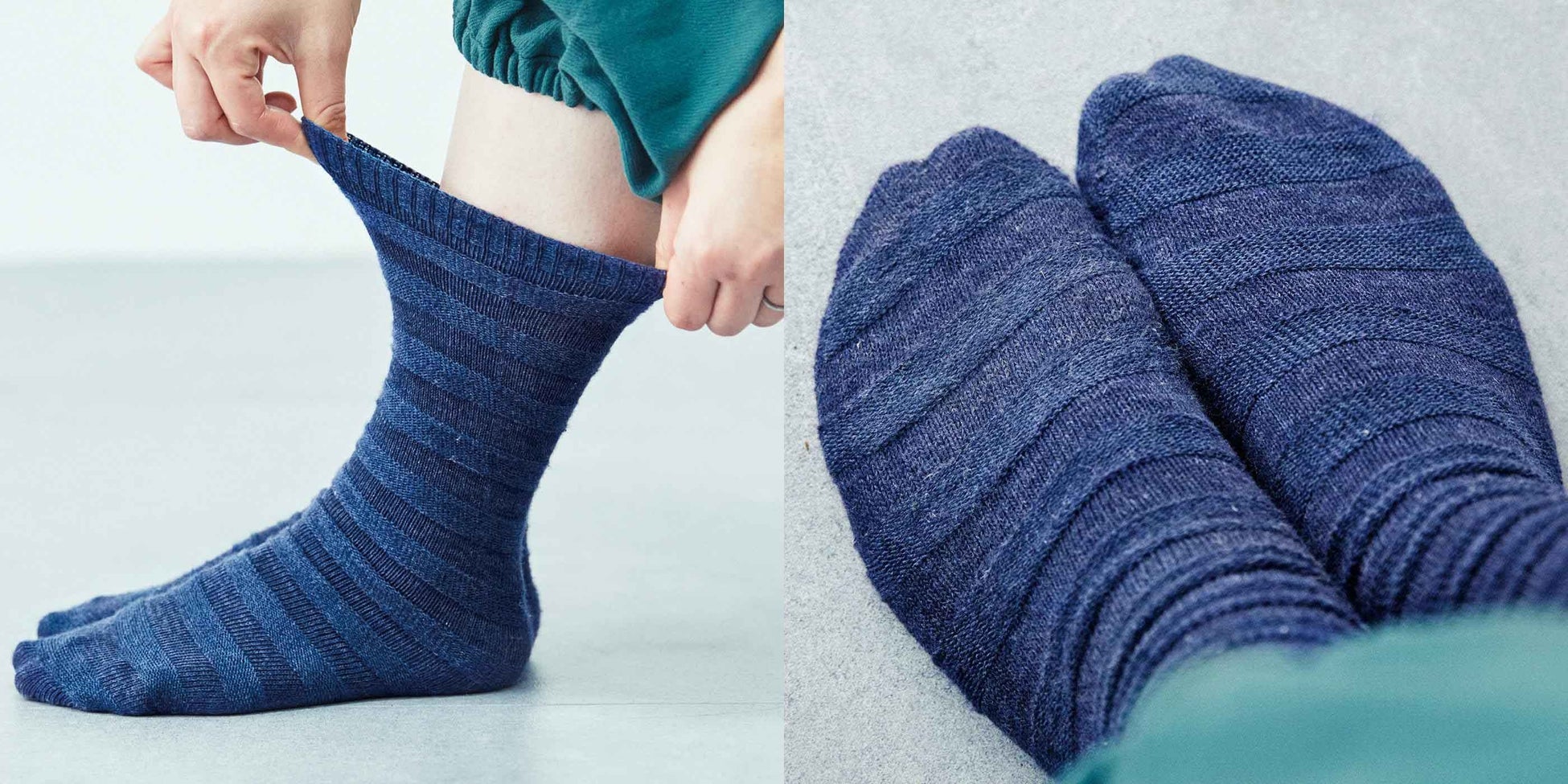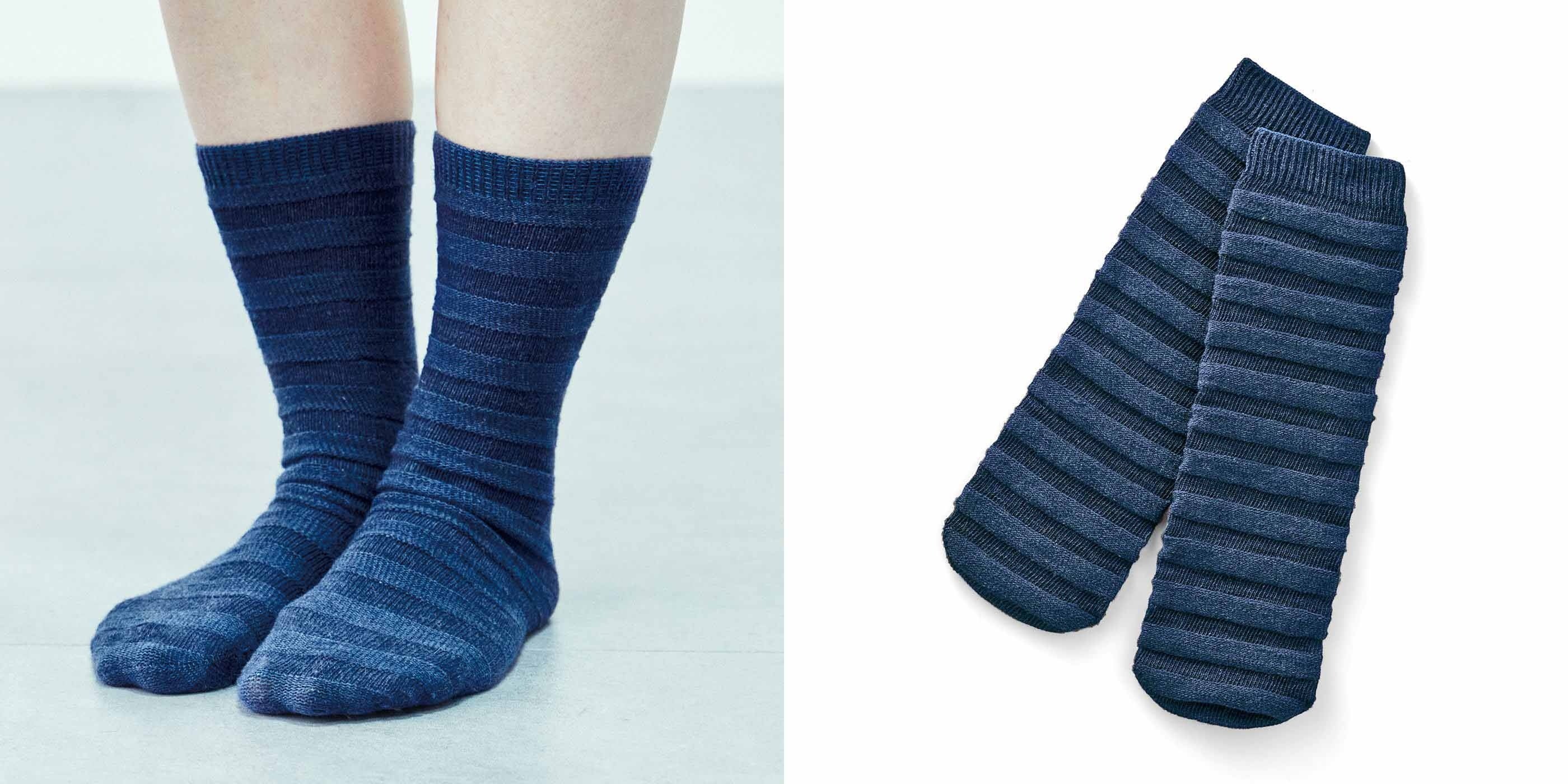 裏返っていたり、左右逆だったり、かかとがずれたり……、 靴下ストレスあるあるを、つま先の縫い目、かかとのない靴下が解決します。裏表・前後ろ・左右がなく、ストレスゼロ。ホールガーメント®で編んでいるから、ぐーんと伸びてフィット感が抜群。凹凸に編んだボーダー柄もさりげなくおしゃれに着こなせます。