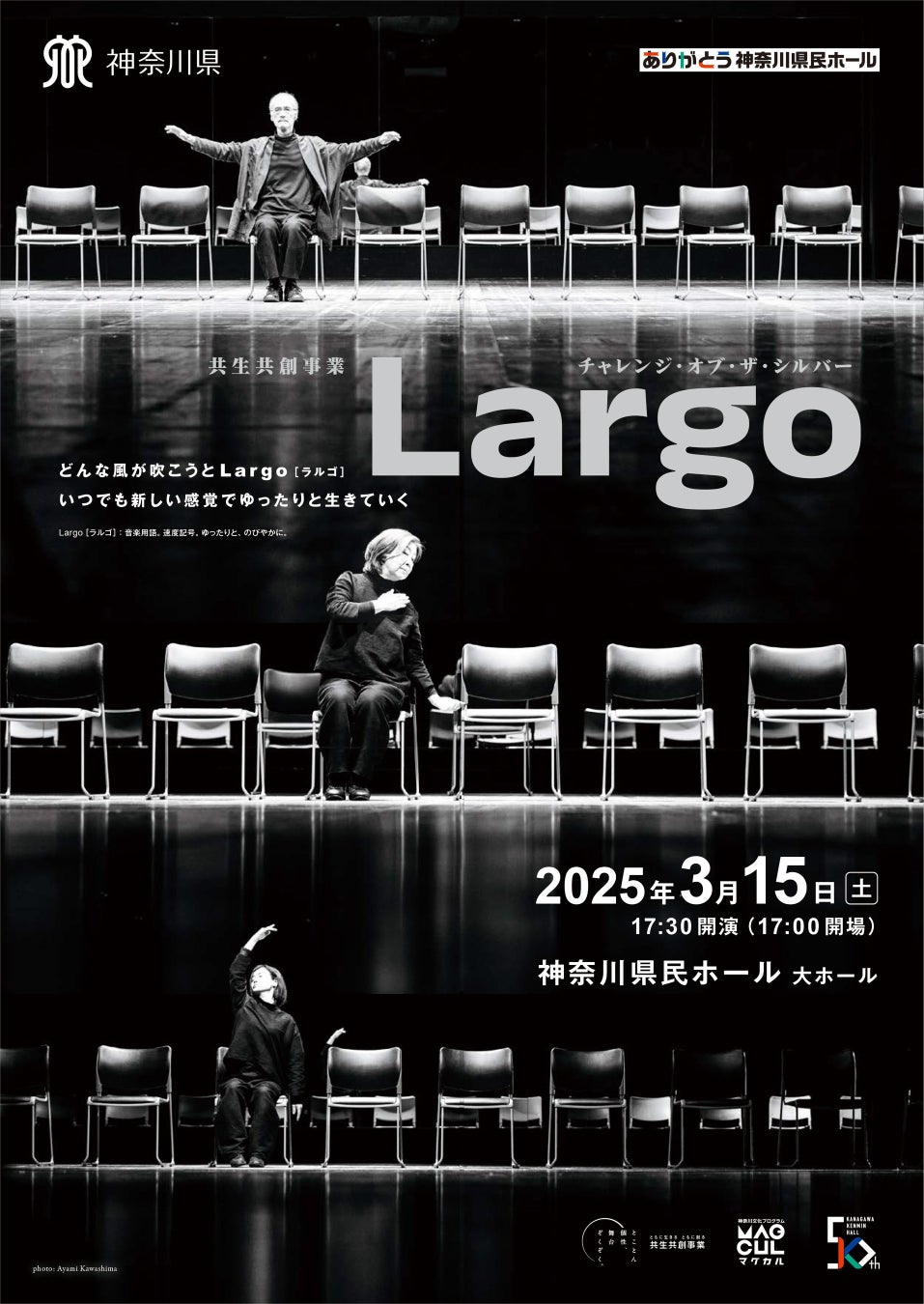 3月をもって休館する神奈川県民ホールに感謝を込め、「ありがとう神奈川県民ホール」イベントの一環として 共生共創事業 チャレンジ・オブ・ザ・シルバー『Largo』が2025年3月15日(土) に神奈川県民ホール(神奈川県横浜市中区山下町3-1)にて上演されます。 チケットはカンフェティ(運営:ロングランプランニング株式会社、東京都新宿区、代表取締役:榑松 大剛)にて1月18日(土)10:00一般発売開始です。