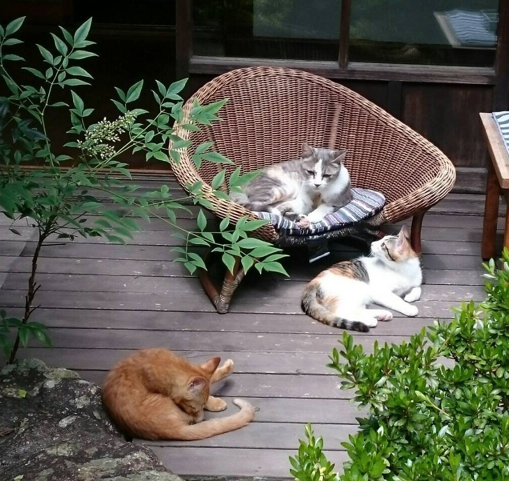 3匹ともとても人馴れしており、お客さんがきたらすぐに寄っていく接客スタイル。くるんは“かぎしっぽ”、ちゃとは“きれいな黄緑色の瞳”、ちびは“少し小柄”なのが特徴です。それぞれが「姫宿 花かざし」近辺で過ごすようになったことから、女将が保護をし、宿に隣接した保護猫カフェ「猫宿 はなはな」をオープン。他にも個性豊かな計13匹がにぎやかに暮らしています。