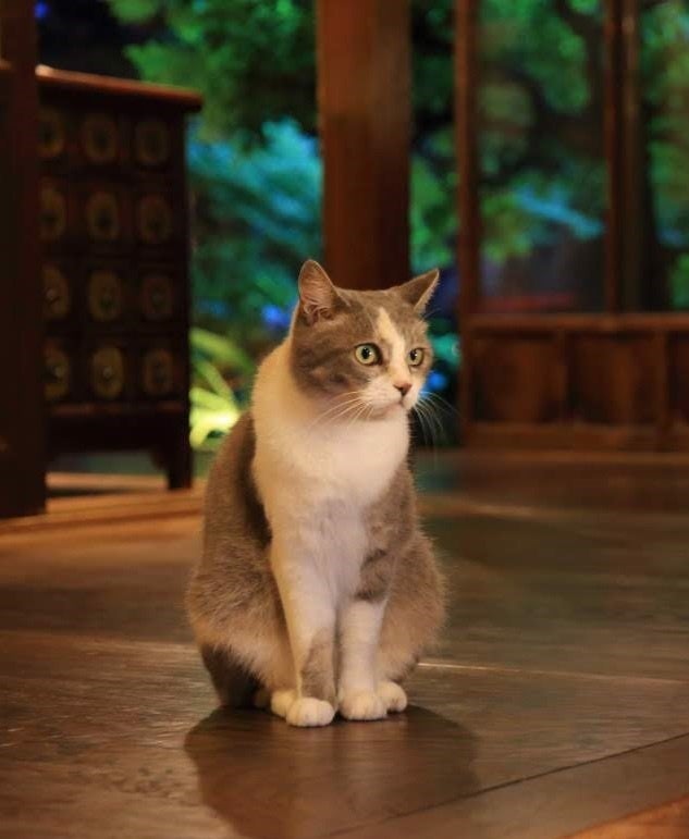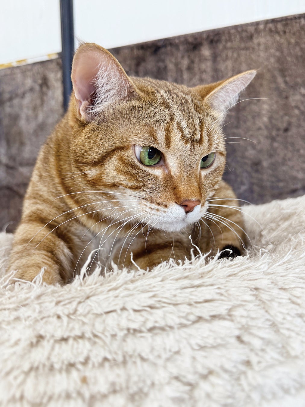 2023年度の「看板ねこ1位」に輝いたラブの兄妹猫でおすましなフクちゃん。ちょっぴり小心者でラブの陰に隠れていましたが、最近では率先してお客さんの元に駆け寄るなど、8匹いる接客チームの中でもリーダー的存在に成長。愛らしい仕草でみんなをメロメロにしてしまうフクちゃんは、カメラを向けるとモデルさんのようなポーズを見せてくれます。