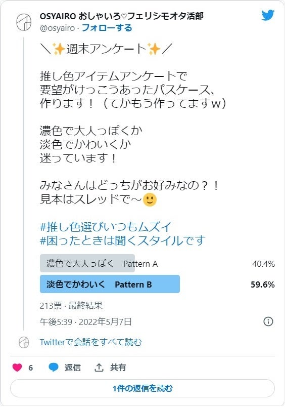パスケースは小さなアイテムなので、推し色が映えるヴィヴィッドカラーにするか、やわらかい印象のパステルカラーにするか、SNSでアンケートを実施しています。
