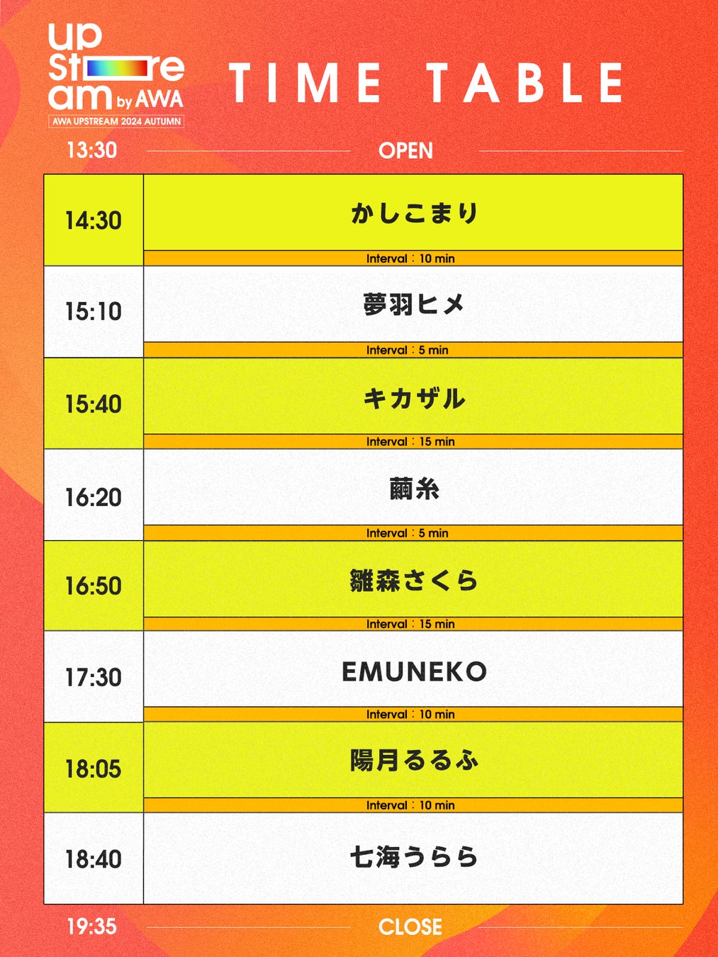 本日、七海うらら、陽月るるふ、かしこまり、AWAラウンジで活躍の人気配信者たちが出演する『AWA UPSTREAM 2024 AUTUMN』のタイムテーブルを発表いたしました。残りわずかとなりますがチケットの一般発売も開始いたしましたので、気になるアーティストをチェックして、ぜひ会場まで足をお運びください。