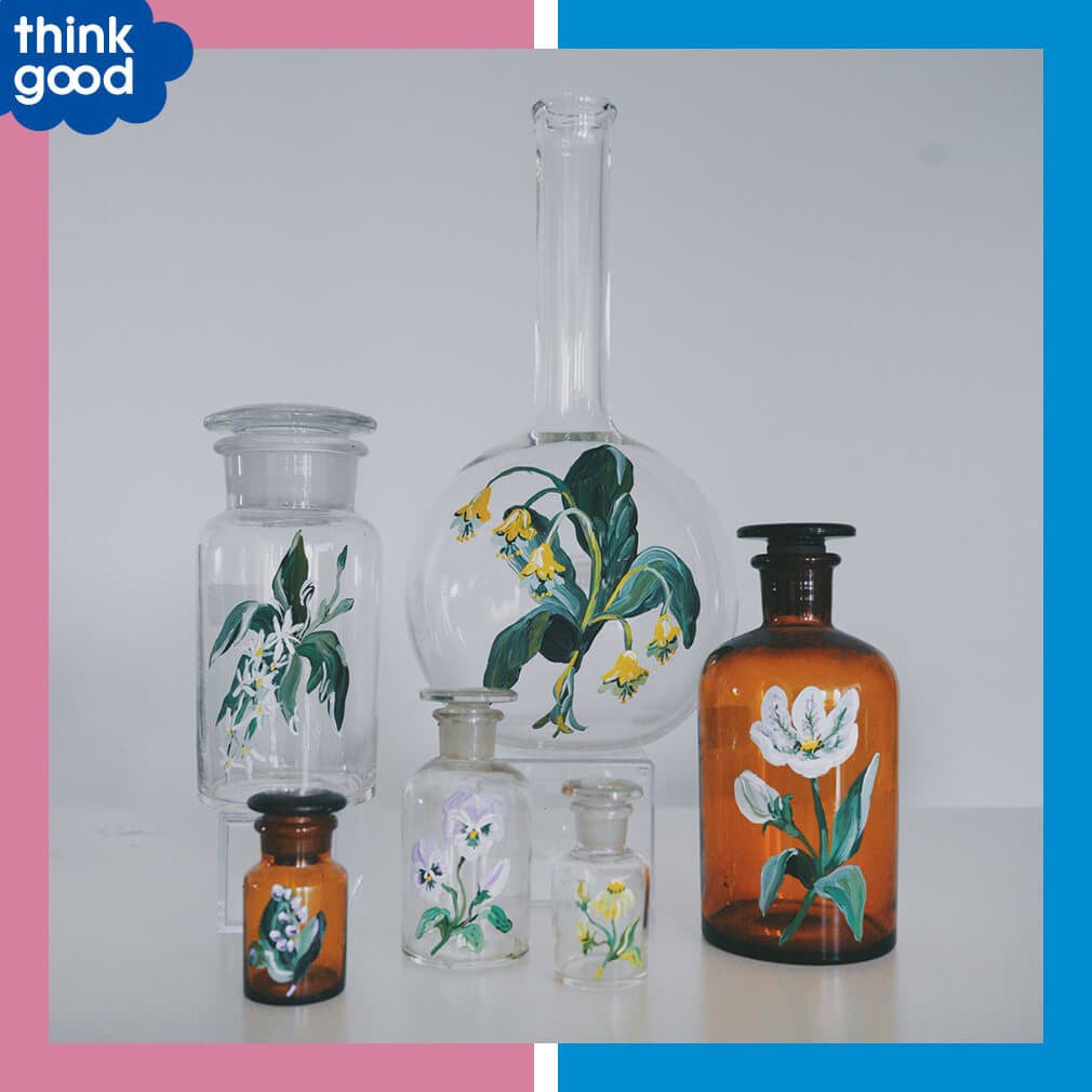 ユーズドのガラス製品やファブリックに、ファッションブランド<トライト>のデザイナー兼アーティスト、青山明生氏が一点一点手作業で施すハンドペイント。使用感による擦れや色の変化を活かし、他にはない魅力を引き出すことで、それぞれのアイテムが個性的な一品へと生まれ変わります。青山氏の手によって、新たな価値が加わり、長く愛用できる自分だけの特別なアイテムとして再び息を吹き込まれます。