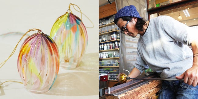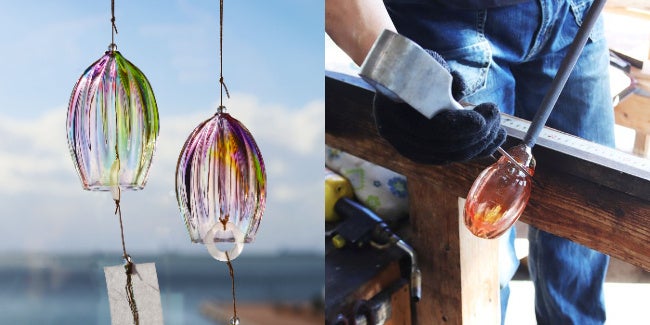 オーロラを溶かしたような色合いの風鈴は、神奈川県小田原市のガラス工房製。風鈴はすべて、ガラス作家・岩沢達さんによる宙吹きガラスで仕上げられたもので、色の混ざり具合もフォルムも、同じものはふたつとありません。ガラスなのにどこかあたたかみが感じられるのは、一点ずつ手作業で作られているからこそ。光を受けた凹凸から生まれるカラフルな影も、ため息ものの美しさです。