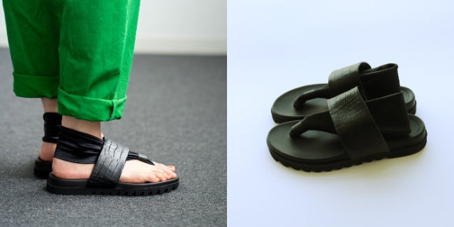 神戸・長田で40年以上も靴づくりを続けてきた工房が、ずっと大切にしてきた定番のトングシューズ。「毎日履けるように」と丁寧に作られたそのクオリティーと真摯にモノづくりに向き合う姿勢に惚れ込んだ、日本職人プロジェクト特別バージョン。今シーズンのNEWカラーは、ベーシックでありながら個性が光る〈クロコ型押し柄・ブラック〉。21.0~26.5cmまで対応する充実のサイズ展開で、素足でさらっと履くのはもちろん、5本指や足袋ソックスを合わせればシーズンレスに活躍します。