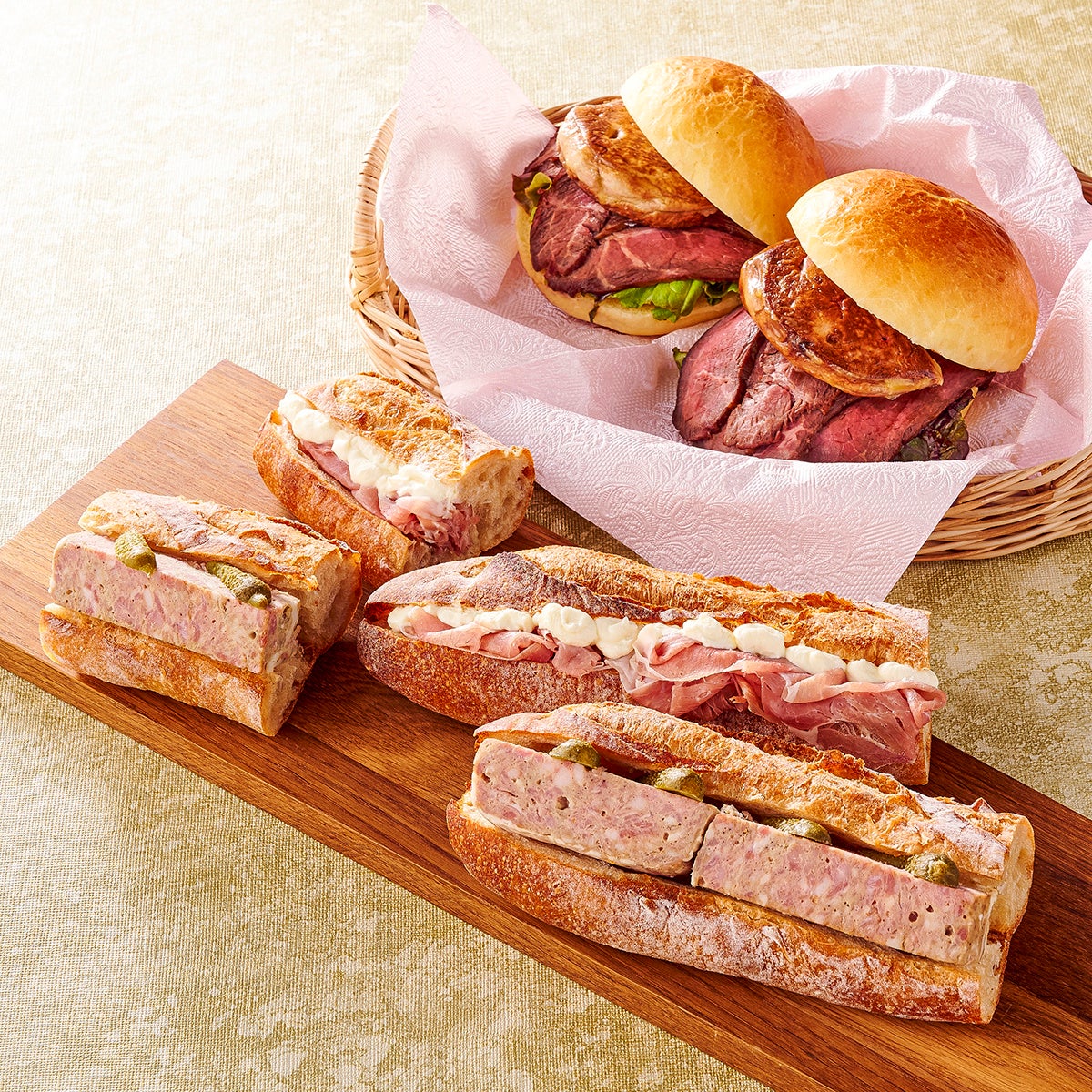 しっとりとした食感に旨みがあふれるパテに、ピクルスの酸味がアクセントになったバゲットサンド。ブリオッシュで、ローストビーフとフォアグラをサンドした贅沢なサンドイッチも登場。