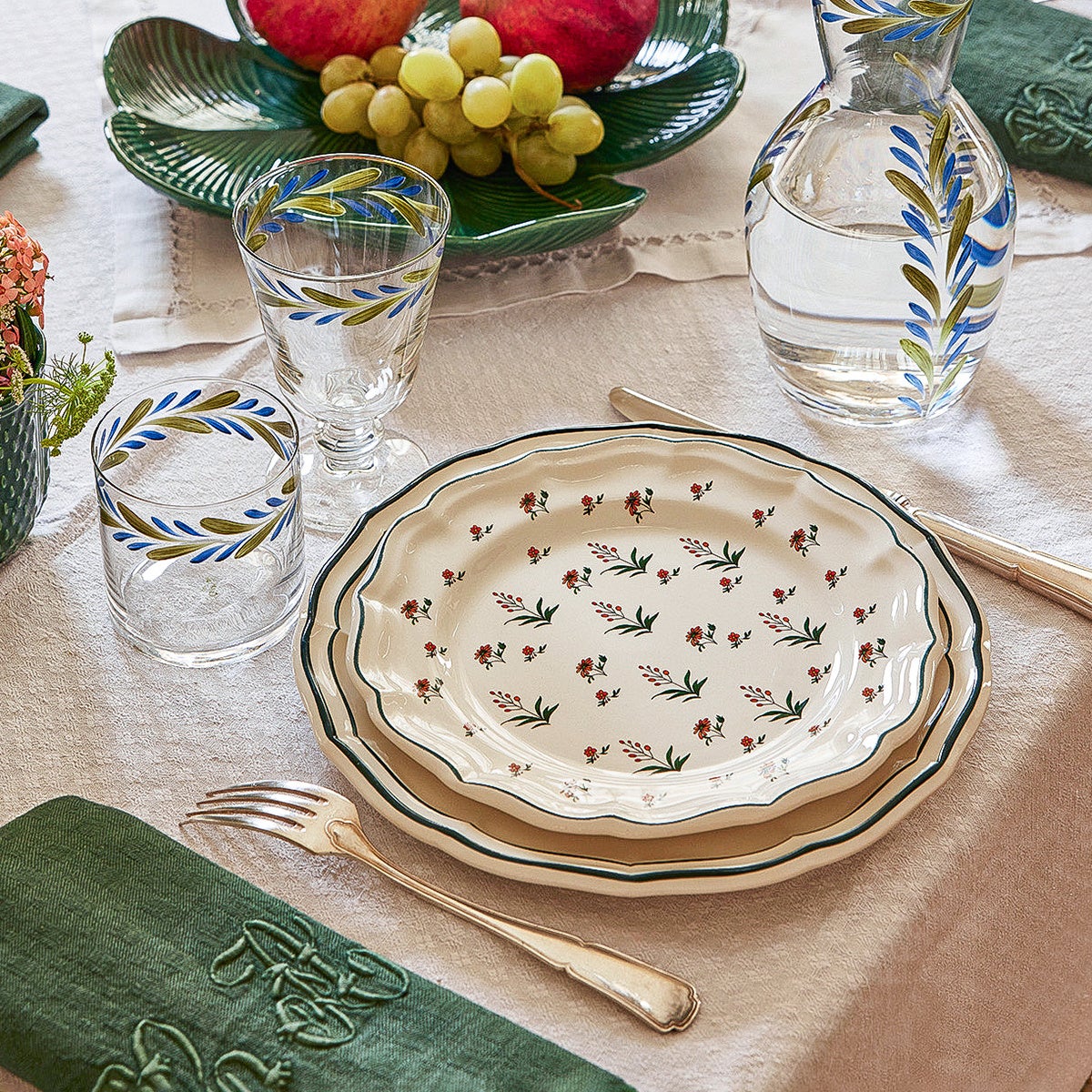 2025年の新作「エルビエ・パラディ」シリーズ。植物標本をテーマにしたクラシカルな雰囲気の花柄は他のデザインとのコーディネートも相性がよくテーブルを華やかに彩ります。