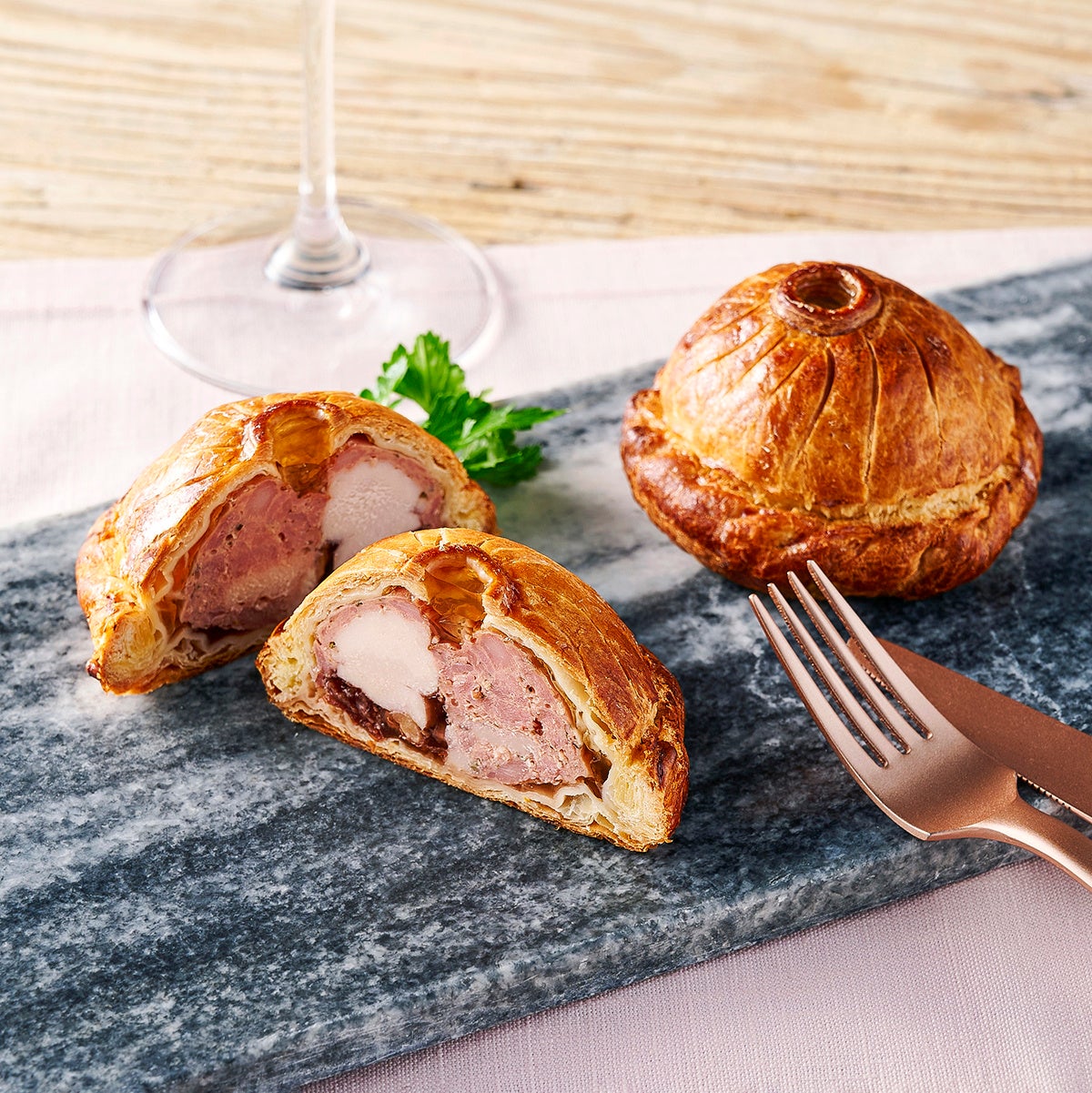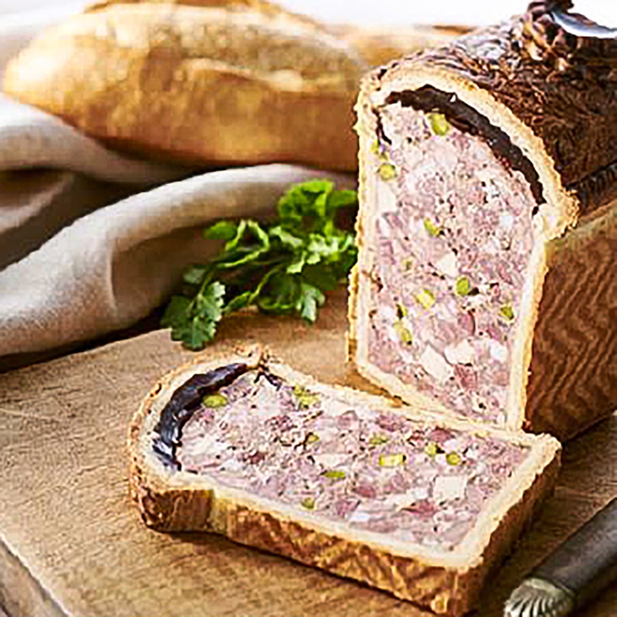 クリームチーズや生クリームでまろやかに仕上げたチキンパテに、ササミ、セミドライフルーツ(イチジク、アプリコット、クランベリー)、香ばしいナッツ(ピスタチオ、クルミ)を加えてパイ生地で包み、しっとり焼きあげた一品。