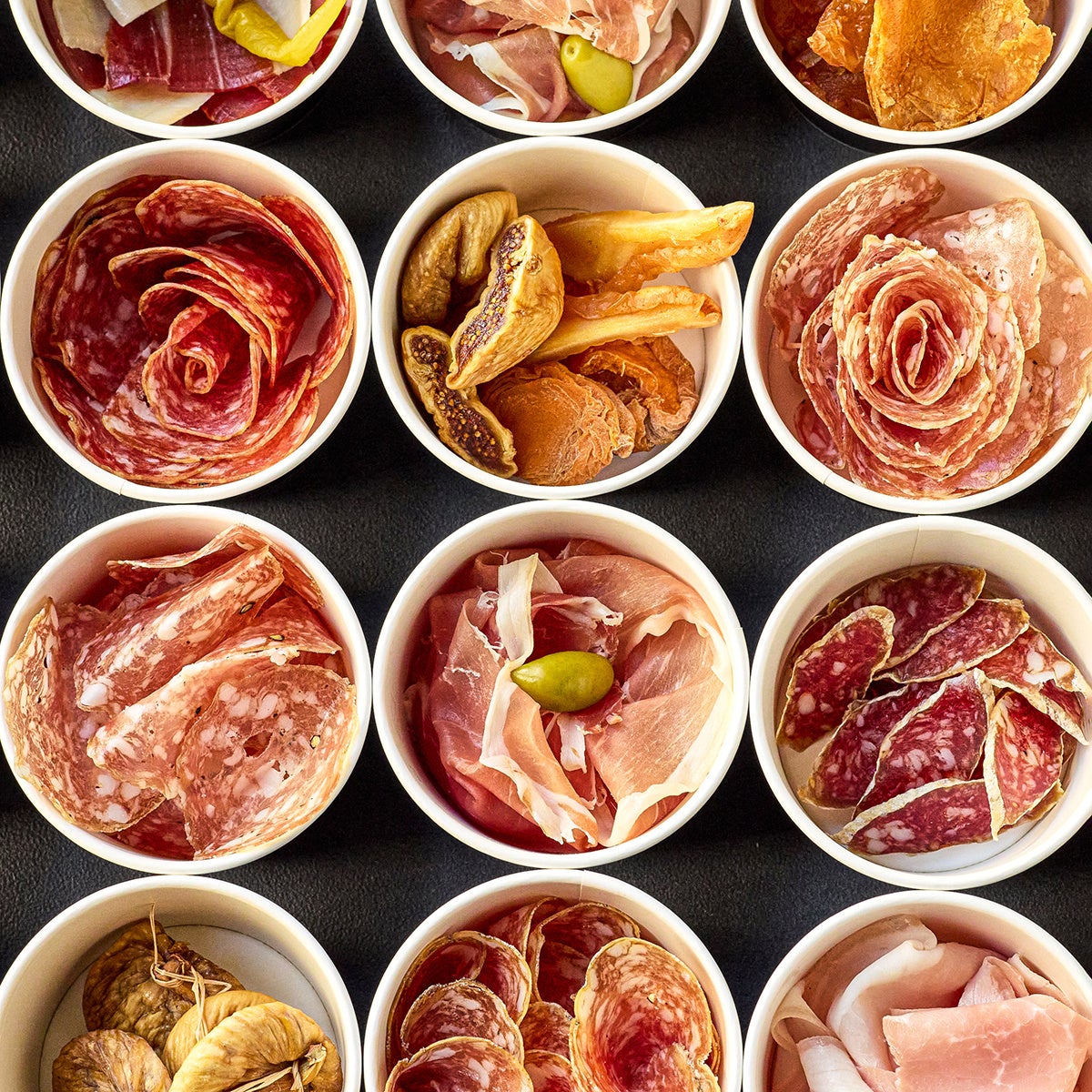 味わい深い生ハムやサラミを、手軽につまんでいただけるようミニカップでご用意。いろいろな組み合わせを楽しめる。