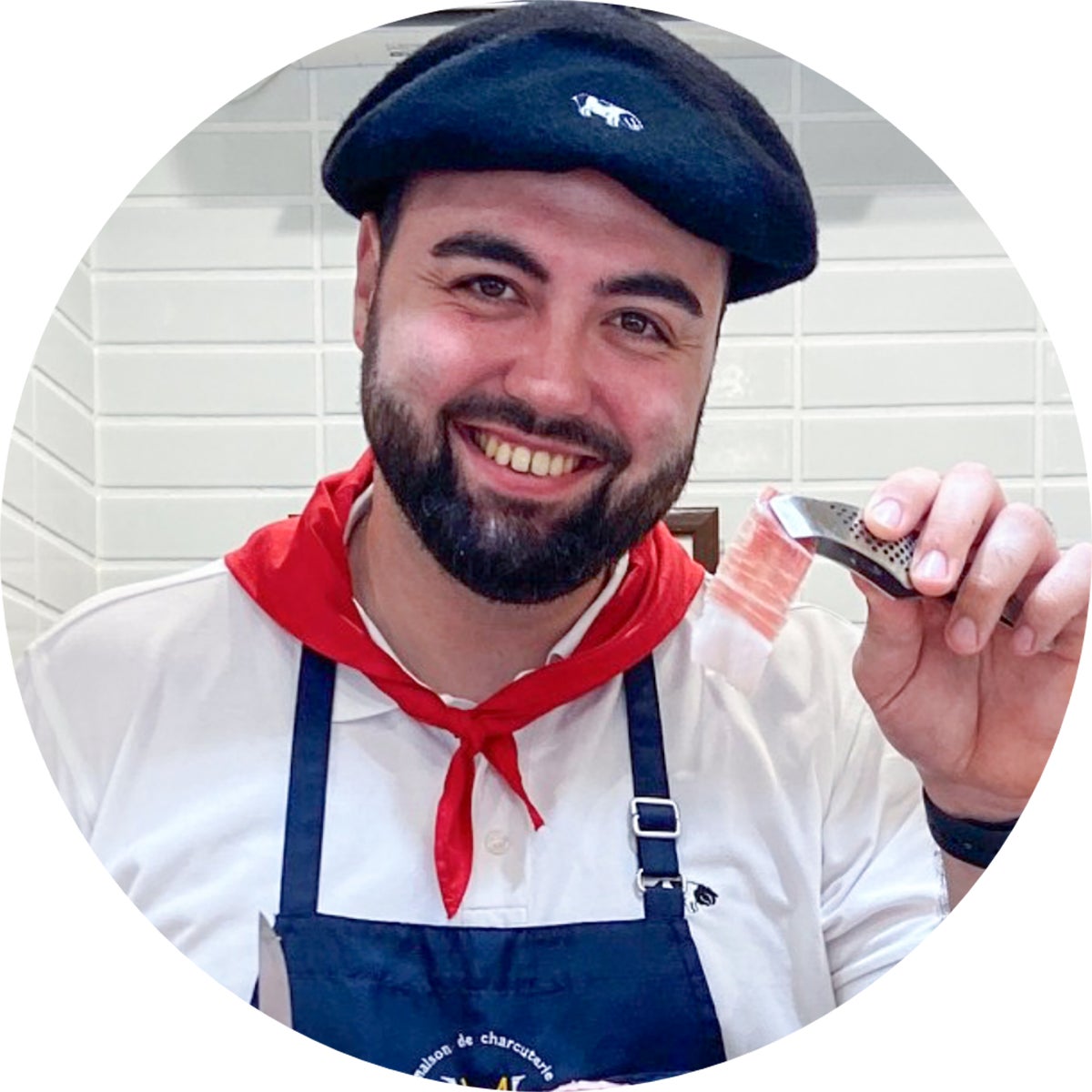 オテイザ社のプロモーション担当のアレクサンドル氏による、骨付き生ハムの切りたてもご用意。