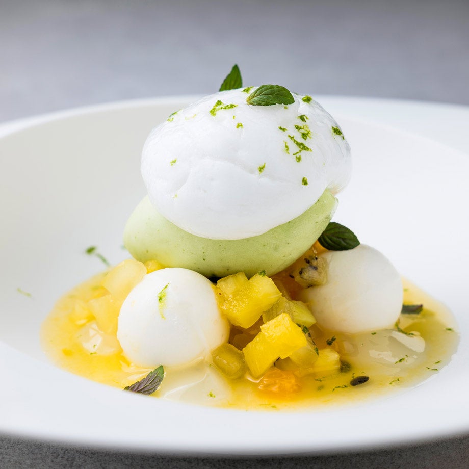 さまざまな果実と野菜を新生姜のシロップに漬け込みました。バジルの利いたパイナップルのソルベとレモングラスのムースゼリーを合わせた、爽やかな味わい。