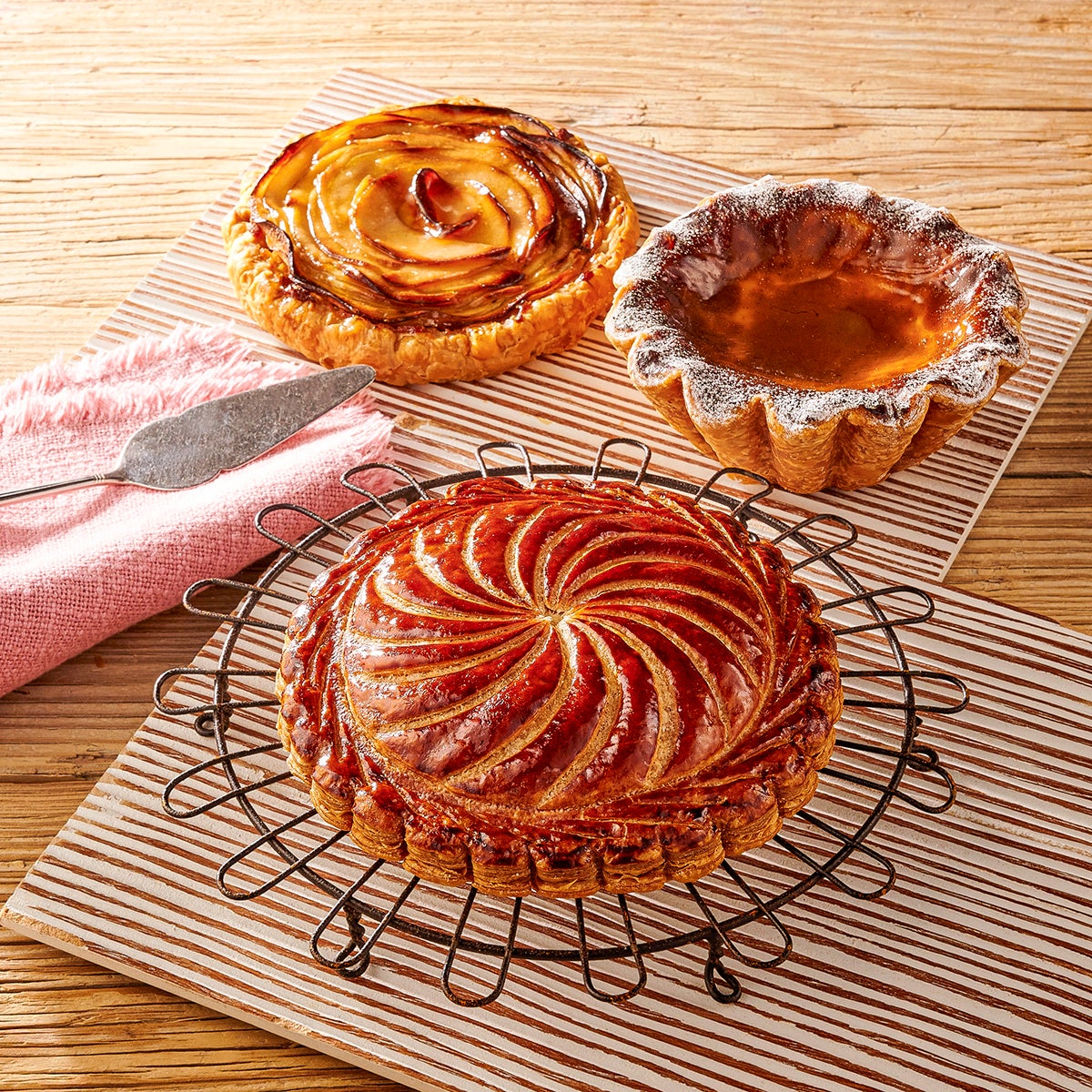 契約農家から仕入れたフルーツと特製フィユタージュとアーモンドクリームで仕上げた「ガレット・オ・フリュイ」や、入手が困難なタヒチ産の高級「タヒチバニラ」を使用した人気商品「フラン・トラディショネル」。フランス・ピティビエなどの名物菓子をシェフの技術で表現。