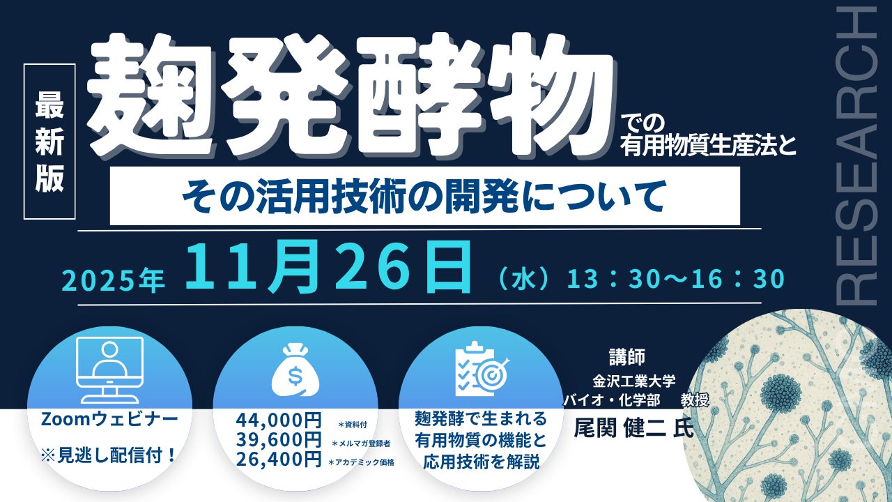 【ライブ配信/Zoom】「麹発酵物での有用物質生産法とその活用技術の開発について」セミナー開催!11月26日(水)主催:(株)シーエムシー・リサーチ