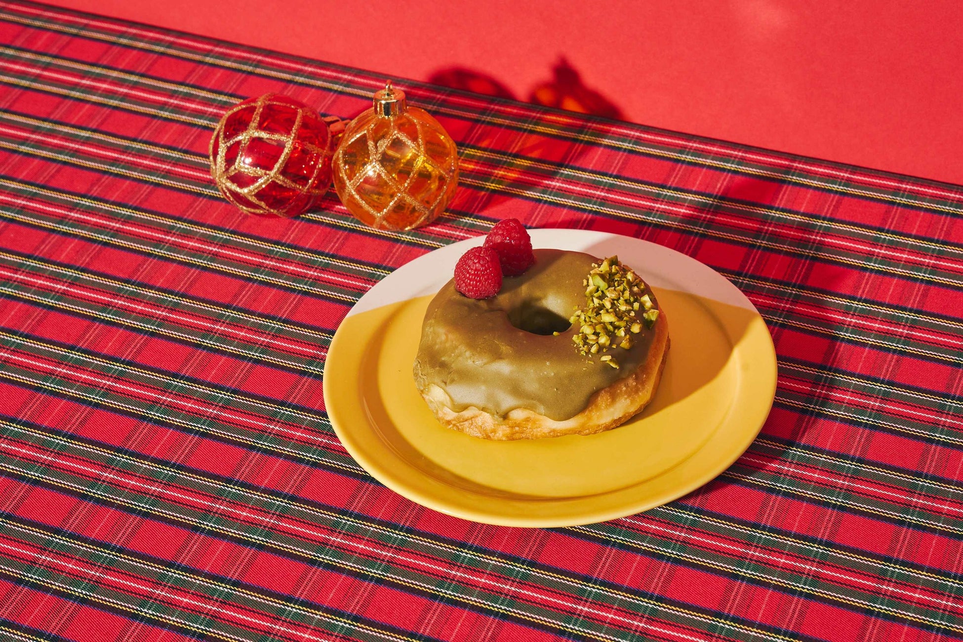 世界一の高品質を誇るピスタチオとも称される、シチリア島ブロンテのピスタチオをふんだんに使ったグレーズに、甘酸っぱいフレッシュなラズベリーをトッピングした甘さと酸味が絶妙な満足度の高い贅沢なドーナツです。