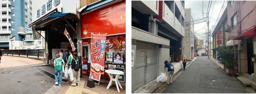 今回は「海ごみの8割は街ごみから」ということで海岸ではなく街中でのごみ拾いを開催。福岡県内ならば、二度の大火に見舞われた北九州市小倉北区の旦過市場を元気づけるのが良いのではないか?と市場の周辺での開催となりました。旦過市場は10月から再整備のため解体工事に入るため、まもなく趣きのある風景は見納めとなります。参加者はその懐かしい風情を楽しみながらごみ拾いに勤しんでいました。