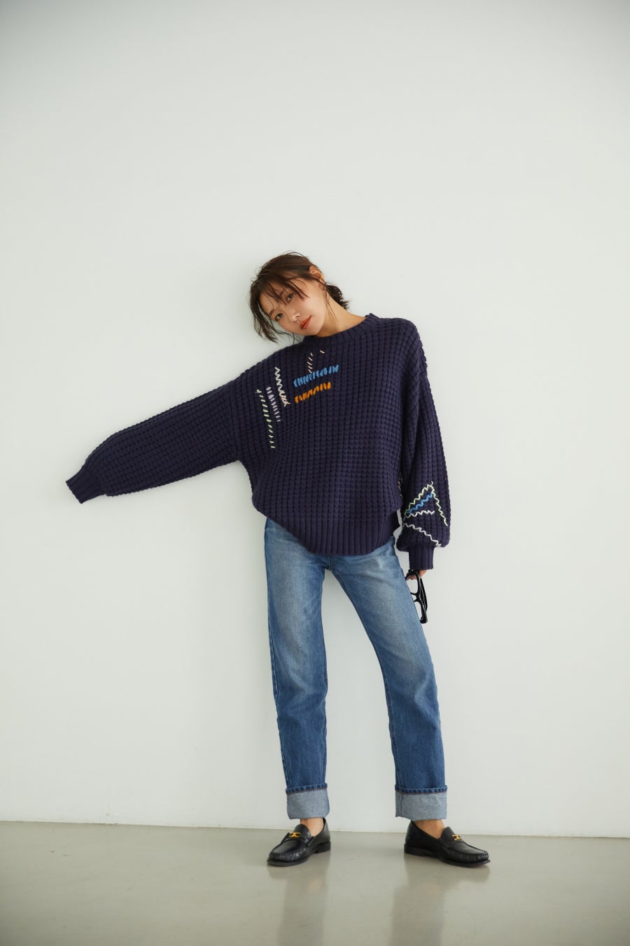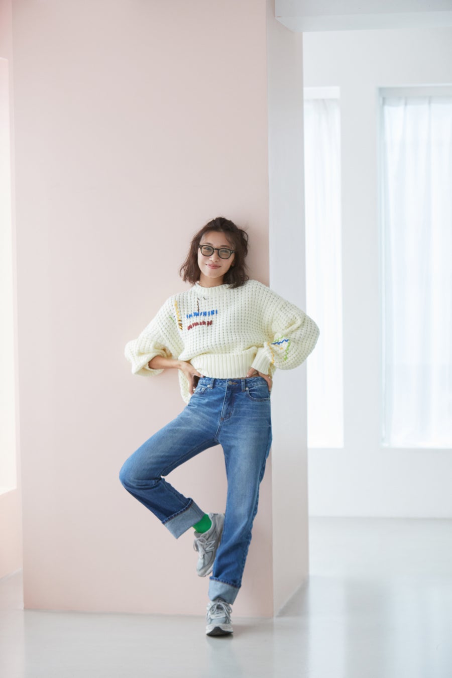 知久友里恵さんとのコラボアイテムは、スタイルアップが叶うシルエットにこだわったデニムと、刺繍のカラーをカラーパレットのように使うことでスタイリングがキマるニット、袖丈や裾のリブなどバランスがとりやすく1枚でもサマになるスウェットの全3型をご用意しました。