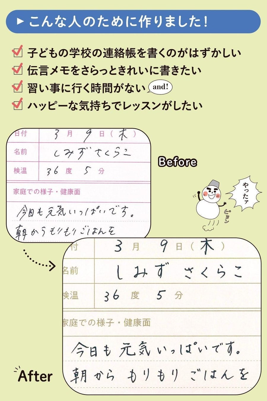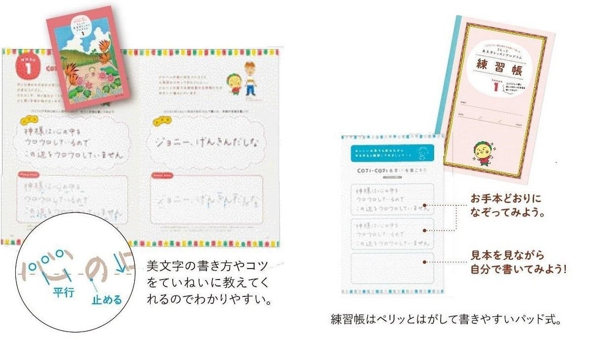 テキストで美文字のコツをつかんだら、練習帳でなぞり書きをします。文字を練習するだけに留まらない、ユーモアと遊び心満載のレッスン内容です。
