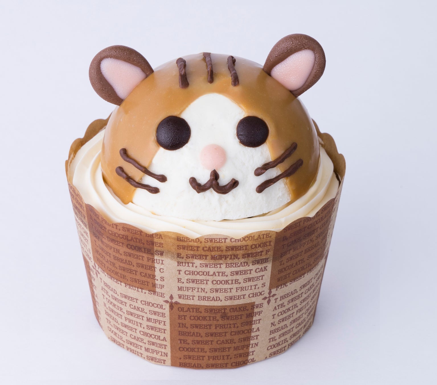 バニラクリームの入ったココアシフォンケーキの上で“にゃらん”がほほ笑むカップケーキ。しっとりふわふわで食感も軽く、見た目もかわいいスイーツです。