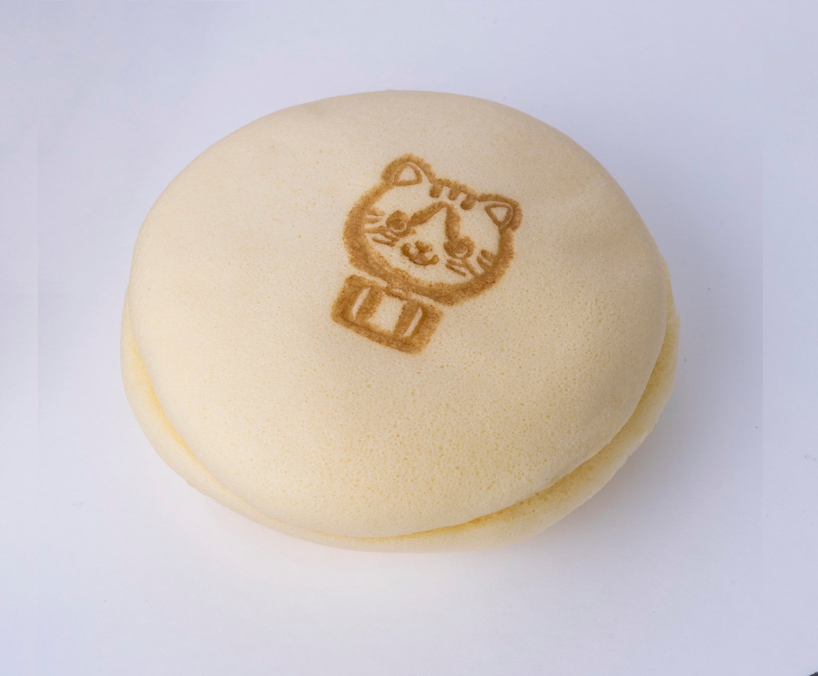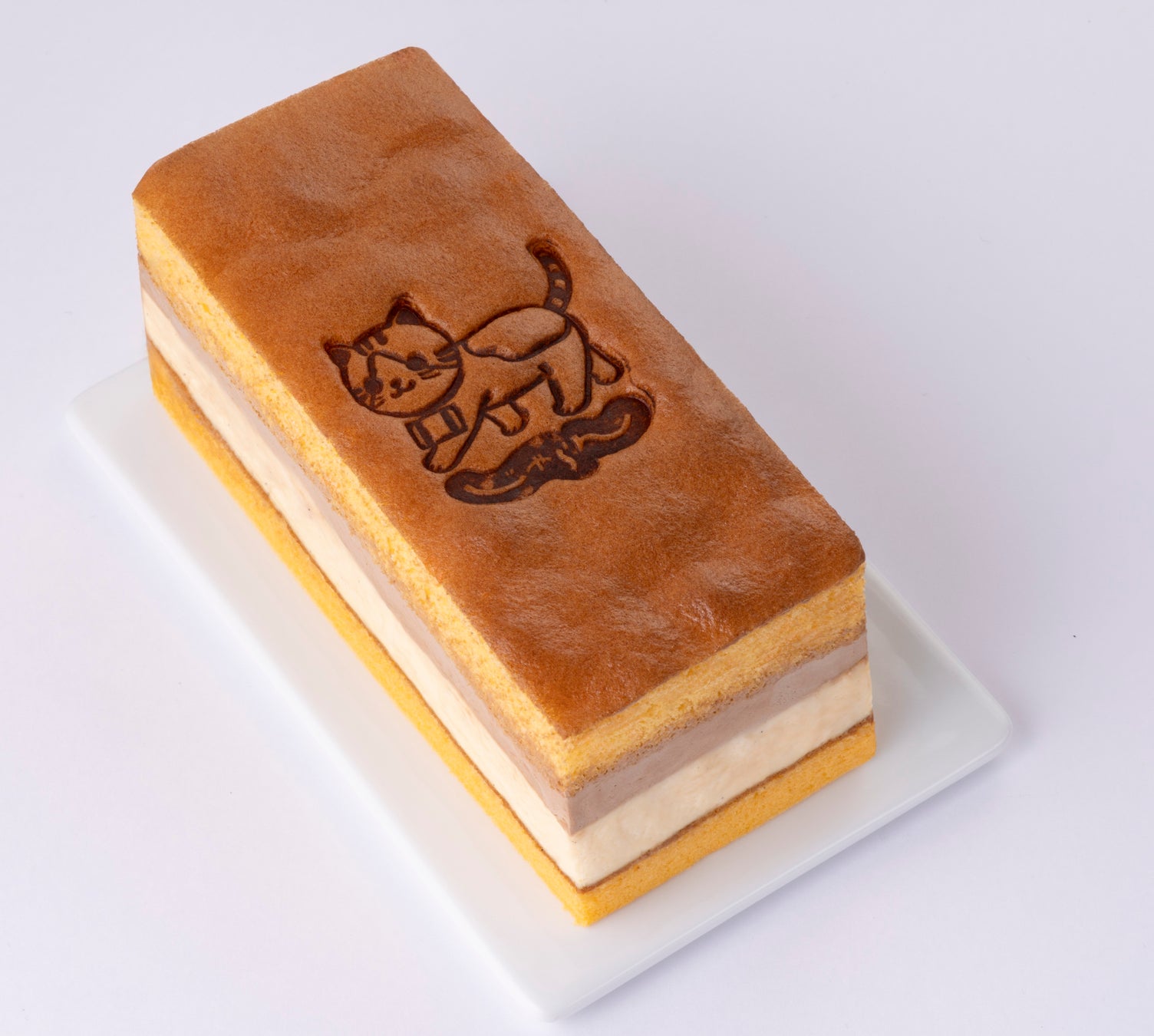 表面の“にゃらん”の焼印がアクセント。濃厚で旨みのあふれる自社ブランド卵『磨宝卵ゴールド』を使用した、しっとりきめ細かいシフォン生地に、チョコ生クリームと、カスタードクリームに生クリームを合わせたディプロマットクリームの2種類のクリームをサンドしました。※数量限定