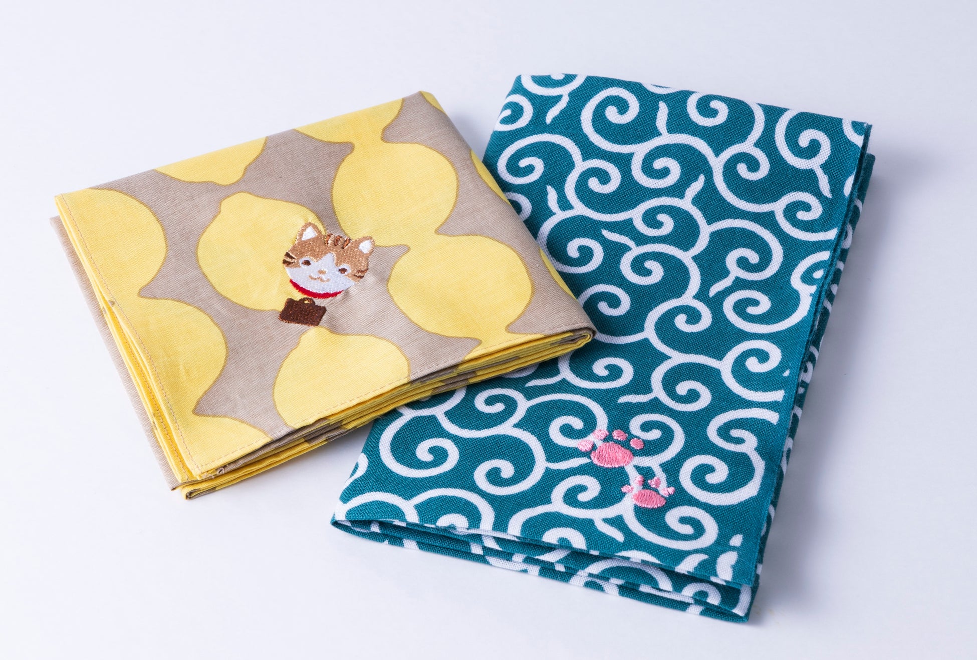 店頭で購入した風呂敷・てぬぐいに、“にゃらん”の顔や肉球のオリジナル刺繍を入れることができます。旅のお供にもぴったりな自分だけのアイテムが作れます。
