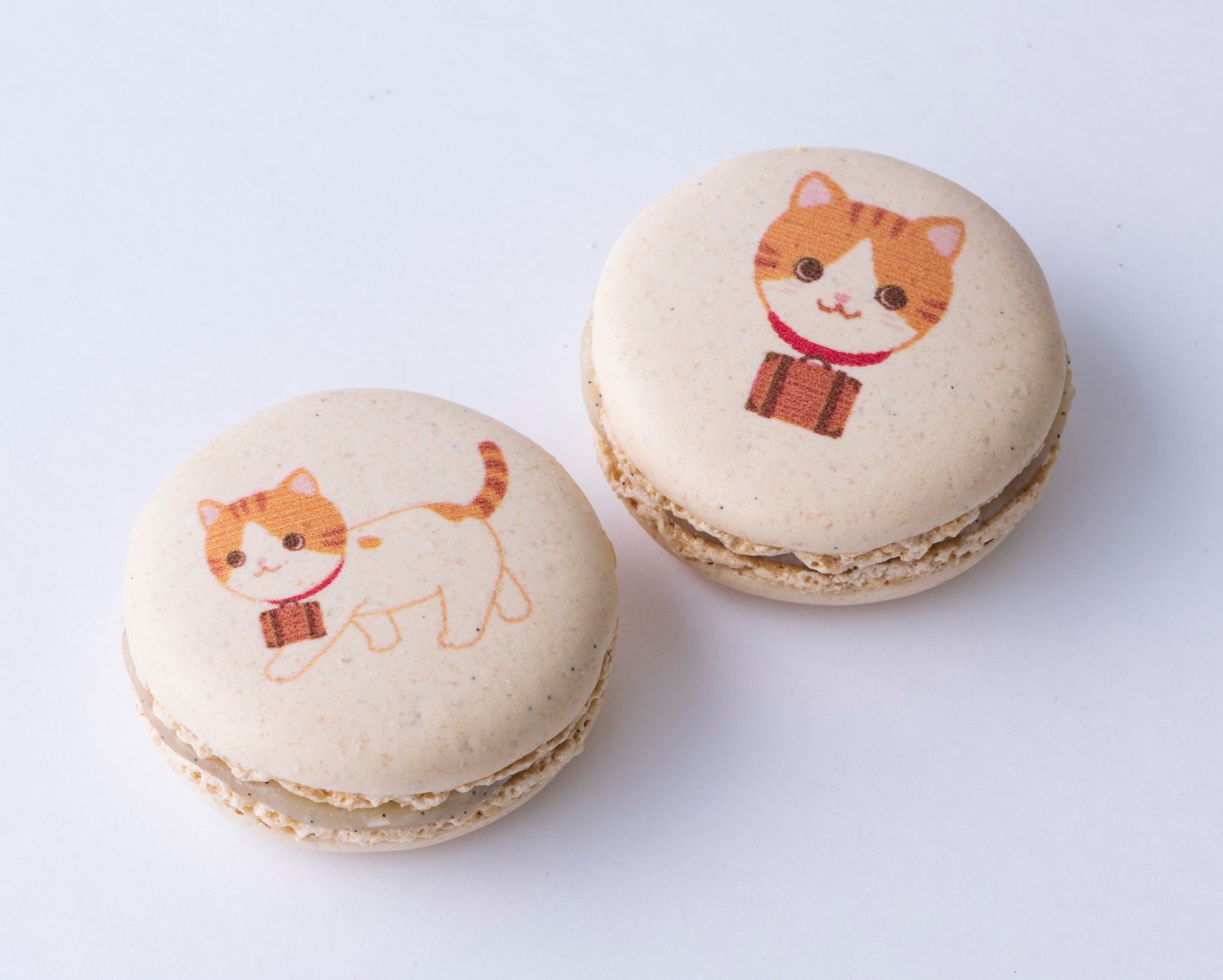 マカロン発祥の、パリの老舗パティスリーメゾン、ラデュレ。バニラ香るホワイトチョコレートのガナッシュ入りマカロンに“にゃらん”をプリントしました。
