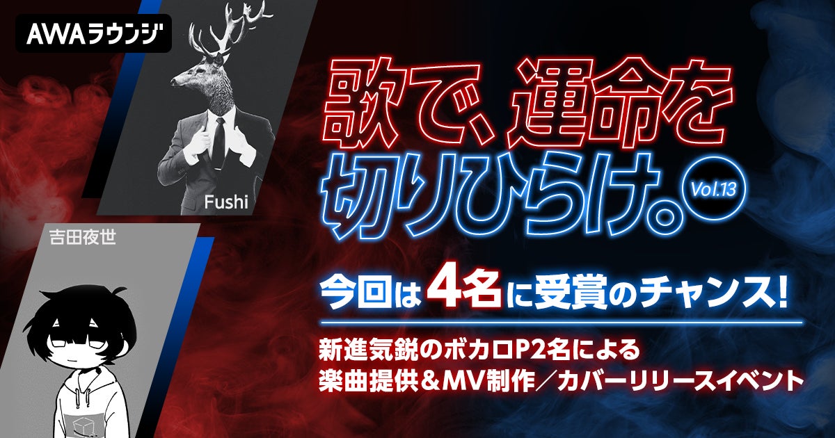 AWA株式会社(本社:東京都港区、代表取締役CEO:冨樫晃己)が運営する、サブスクリプション型(定額制)音楽ストリーミングサービス「AWA(アワ)」は、今年6月に開催し大好評だった、新進気鋭のボカロPによる楽曲提供イベントに続き、2名のボカロPが楽曲提供する『歌で、運命を切りひらけ。 Vol.13』を開催いたします。